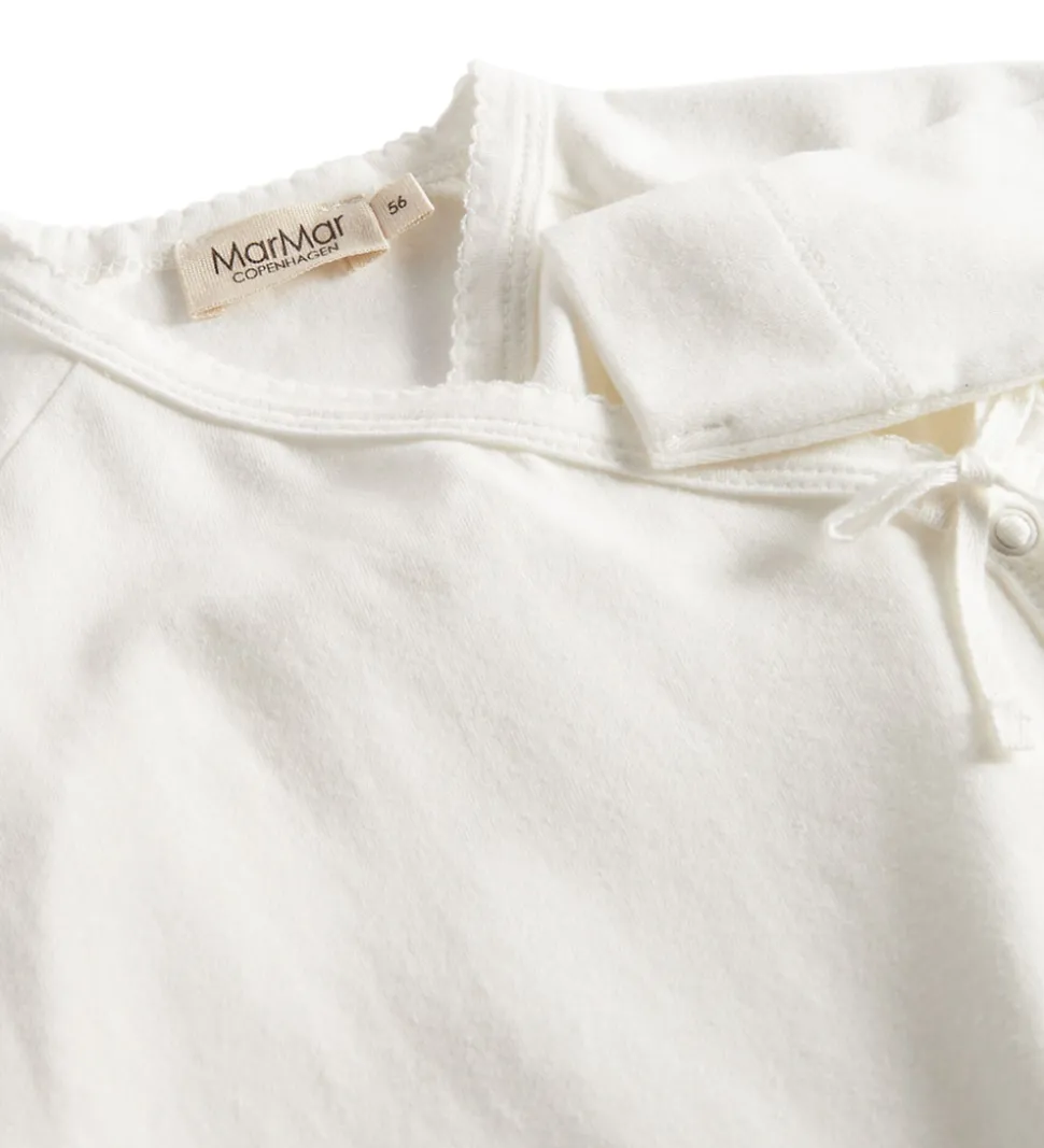 Elegant MarMar heldragt i ensfarvet hvid. MarMar heldragten har lange ærmer og ben med faste fødder, der skaber en helhed. Den åbnes nemt med trykknapper langs siden, hvilket gør den praktisk i brug.
