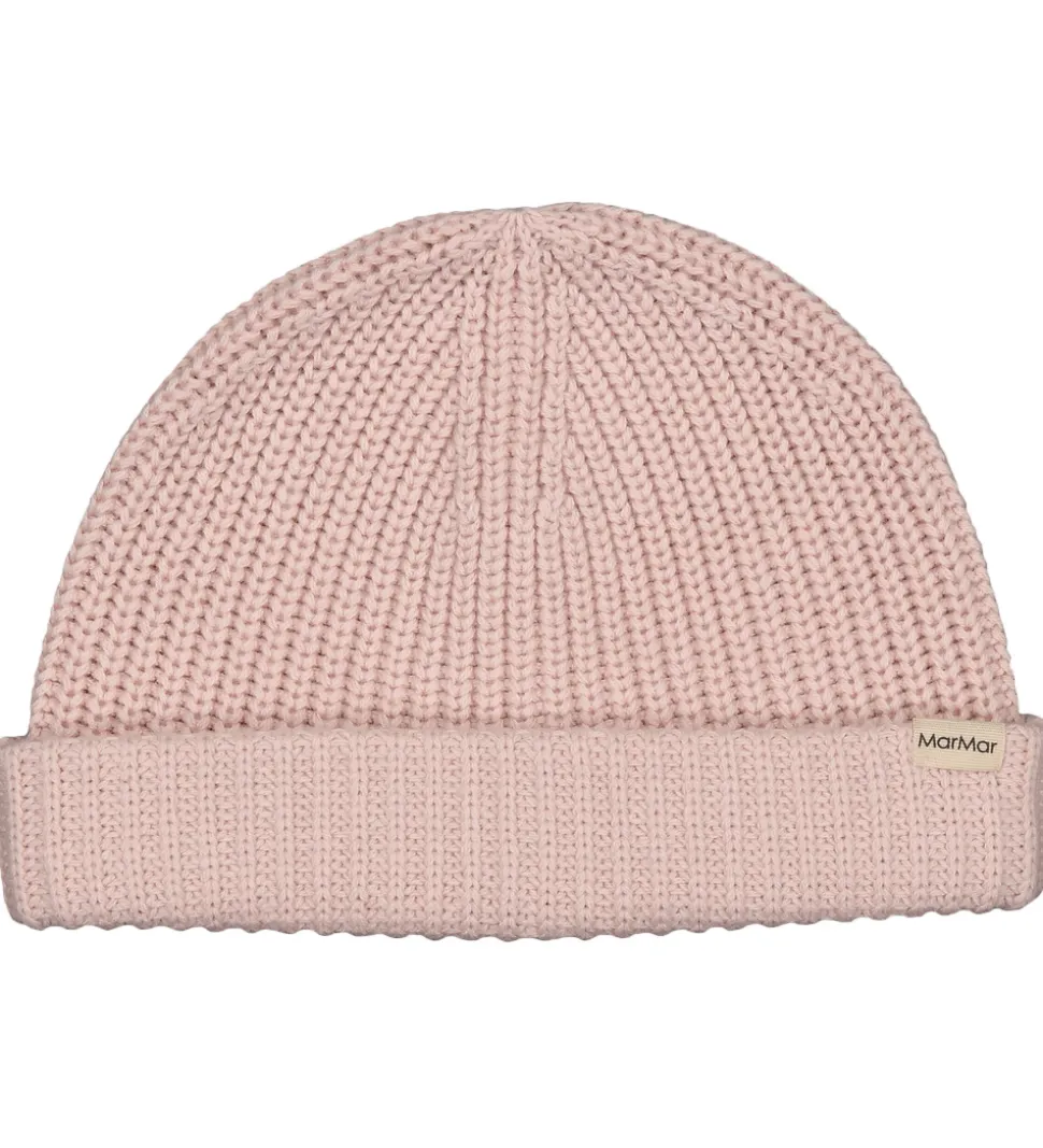 Fin MarMar babyhue i ensfarvet rosa i en strikket kvalitet med ribstruktur. Huen har en rund hovedform, og den har en bred kant med ombuk.