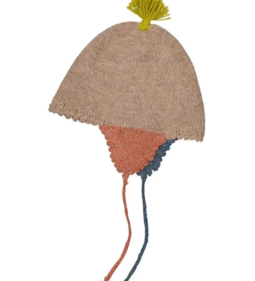 Charmerende MarMar hue i brun med en gul kvast i toppen, og øreklapperne er blå og gammelrosa. Huen bindes under hagen med en snøre. MarMar huen er lavet i en strikket kvalitet af lunt og blødt alpakauld.