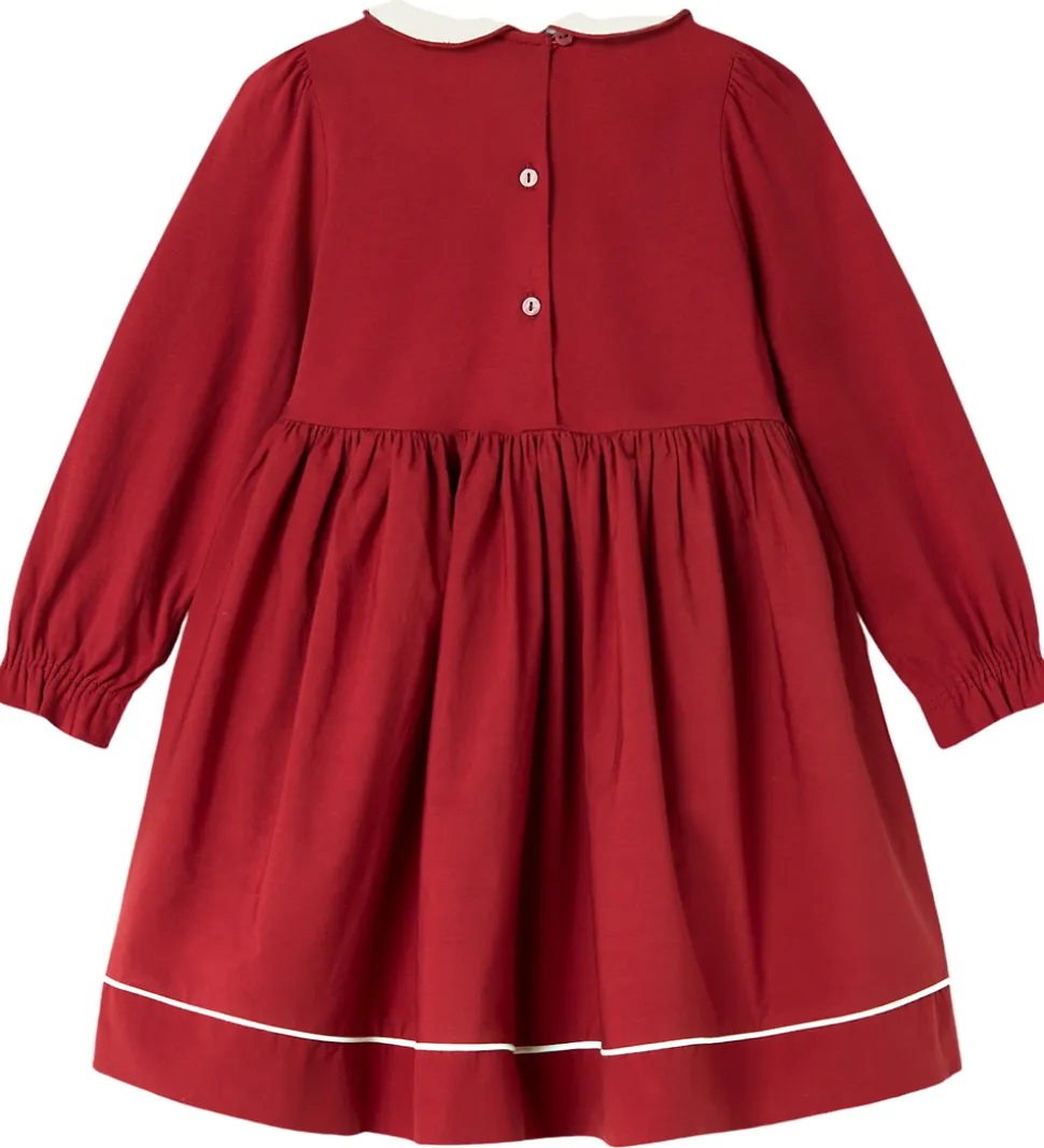 Elegant MarMar kjole i en dyb rød farve. MarMar kjolen har lange ærmer og en flot, hvid krave med små blomsterbroderier. Skørtet er plisseret, hvilket giver et klassisk udtryk, og kjolens kant er detaljeret med en tynd, hvid linje.
