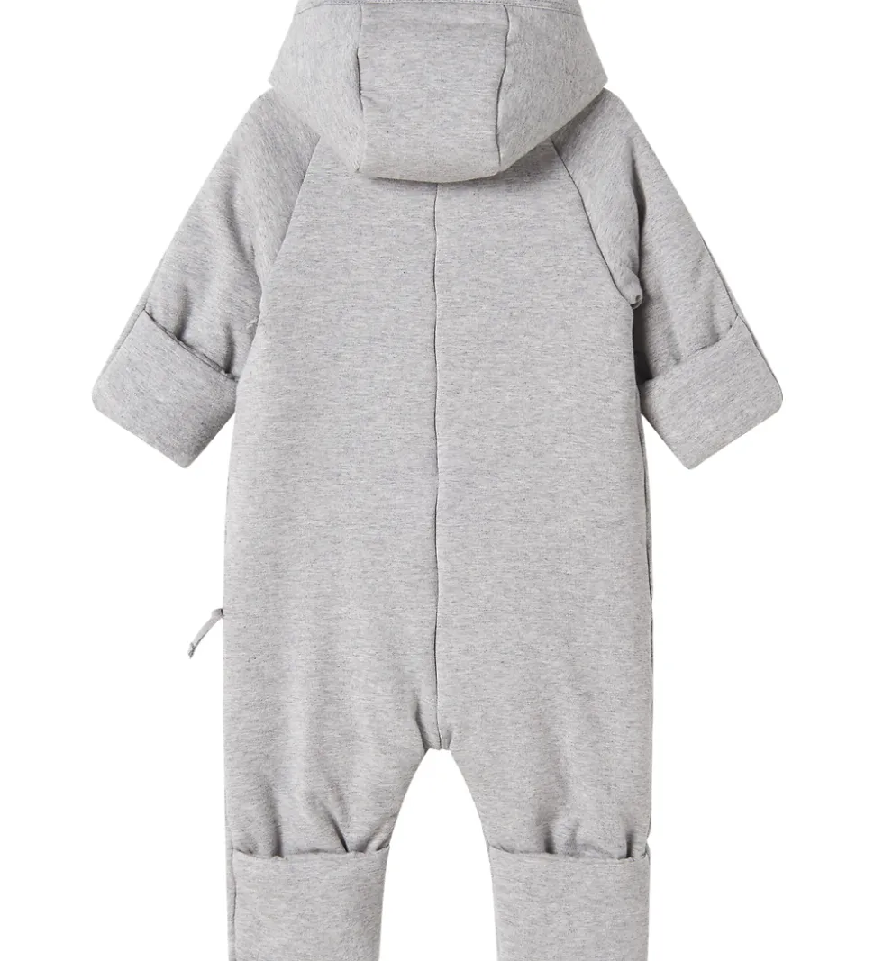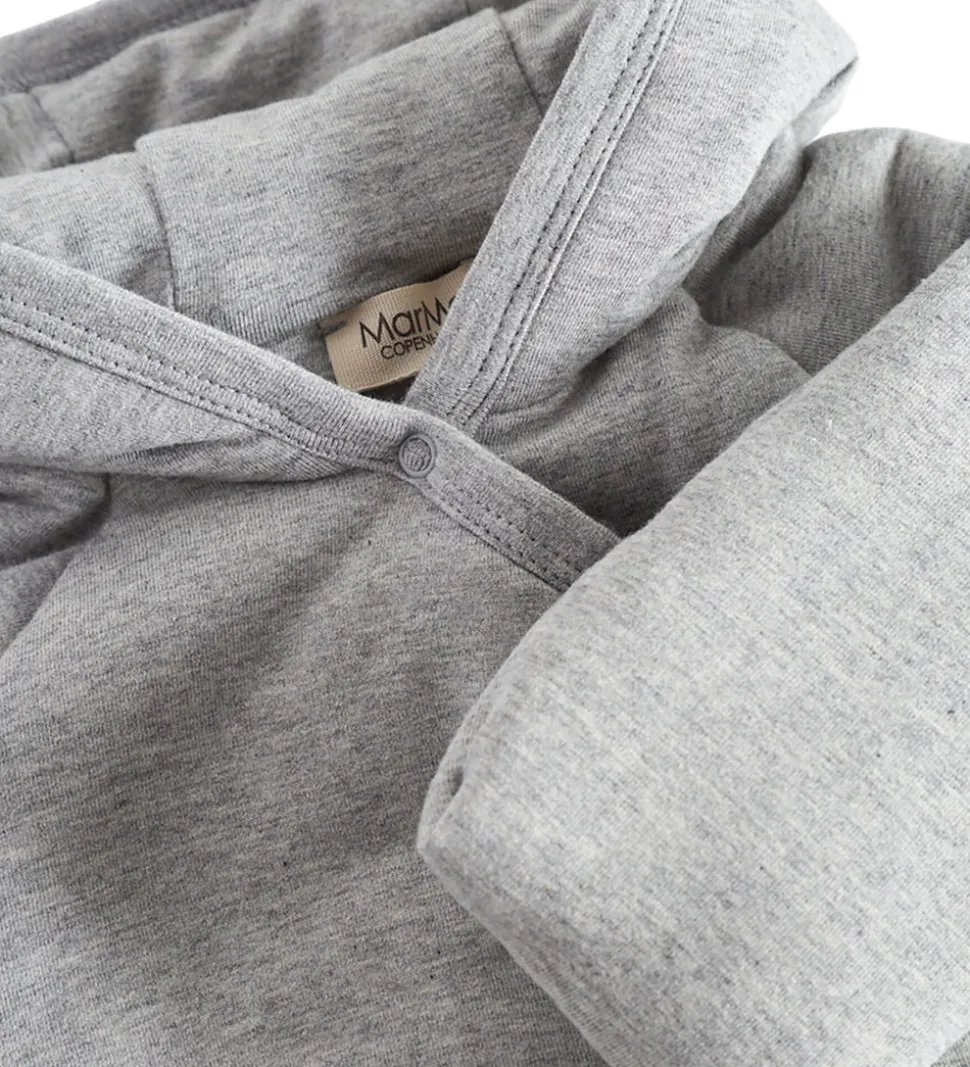 Køredragten har lange ærmer og ben med ombuk samt en praktisk hætte. Den har en slå-om åbning med bånd og trykknapper for nem påklædning. MarMar køredragten er lavet i blødt materiale og har en let vattering, der giver en behagelig pasform.