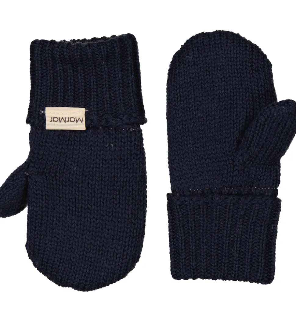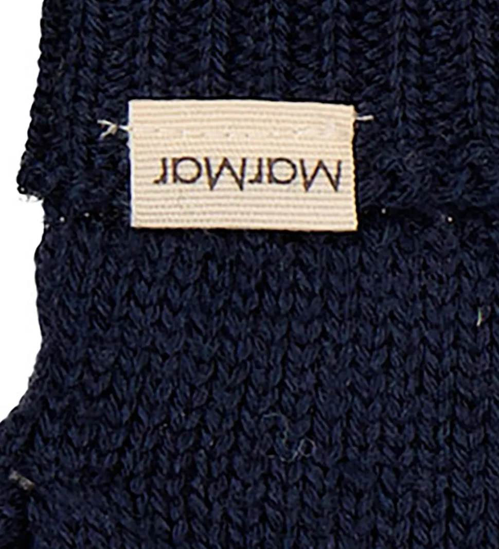 Charmerende MarMar luffer strikket i en dyb, marineblå nuance. MarMar lufferne har en enkel, stilfuld ribkant og et diskret logomærke. Perfekte til at holde små hænder varme på kølige dage.
