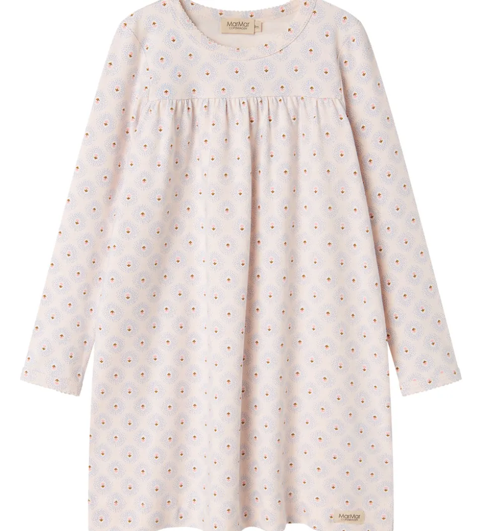 Elegant MarMar natkjole i i en cremehvid nuance og med et fint print af små blomster og prikker i lyseblå og rosa nuancer.