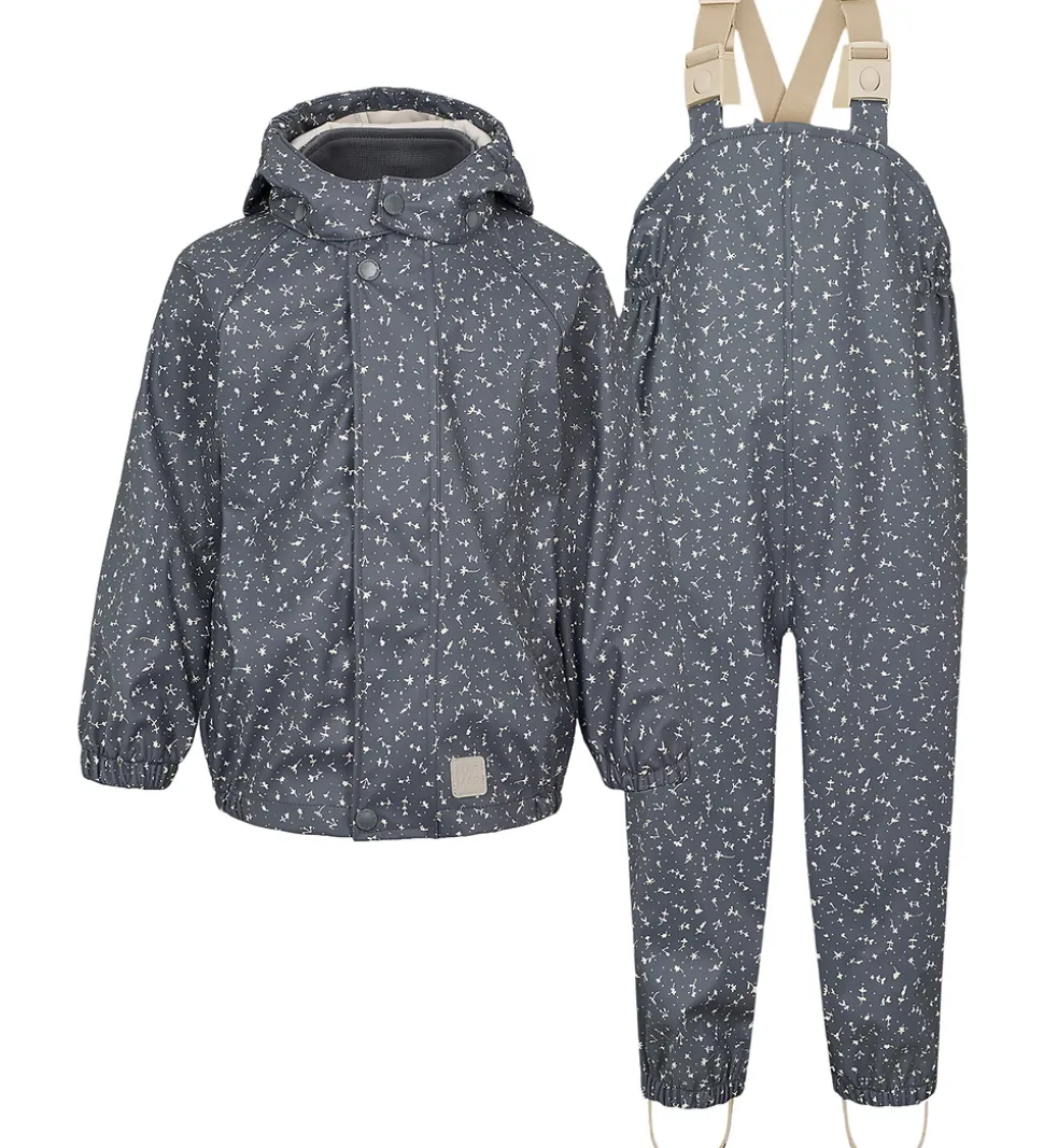 Fint MarMar regntøj i navy med et hvidt blomsterpint, og det er lavet af praktisk PU. Regntøjet består af en regnjakke og et par regnbukser med seler.