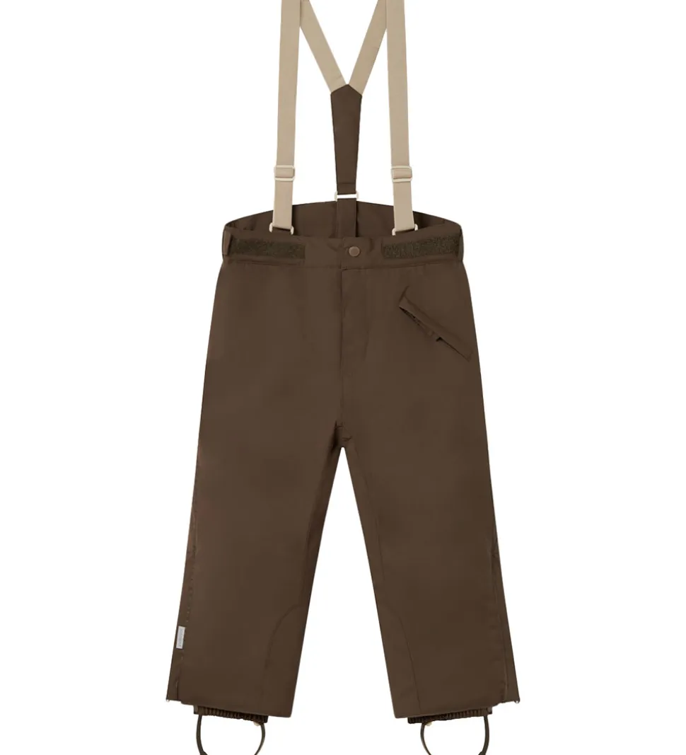 Smarte MarMar skibukser i mørkebrun med lyse seler og refleksdetaljer langs ydersiden af benene.