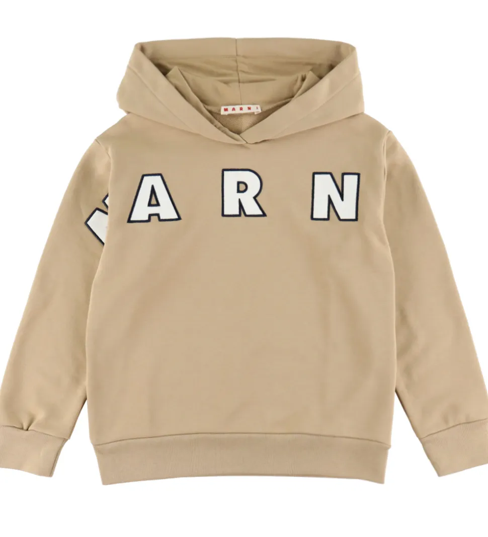 Lækker Marni hættetrøje i beigefarvet sweat, og fortil står der “Marni” med store, applikerede bogstaver i hvid med sorte kanter.