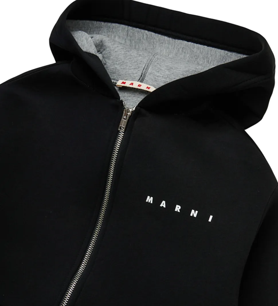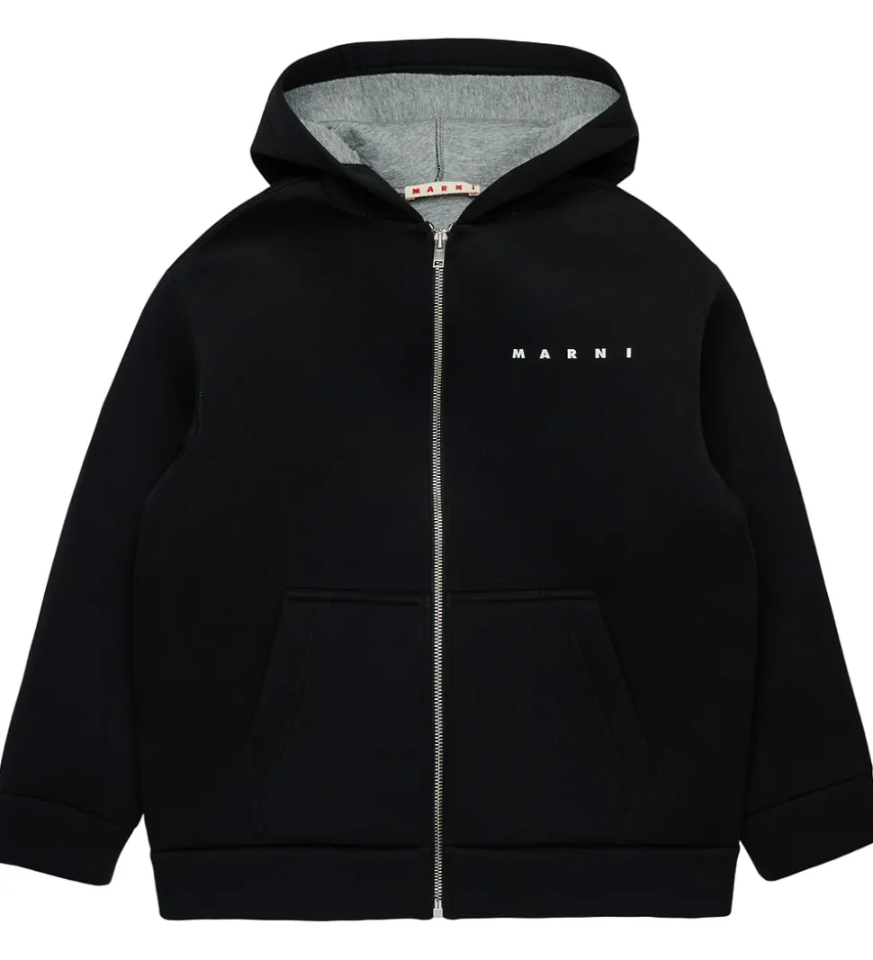 mart Marni jakke i sort neopren, og fortil i venstre side står der trykt “Marni” i hvid.