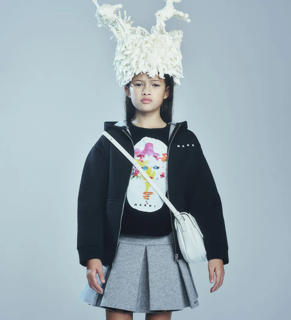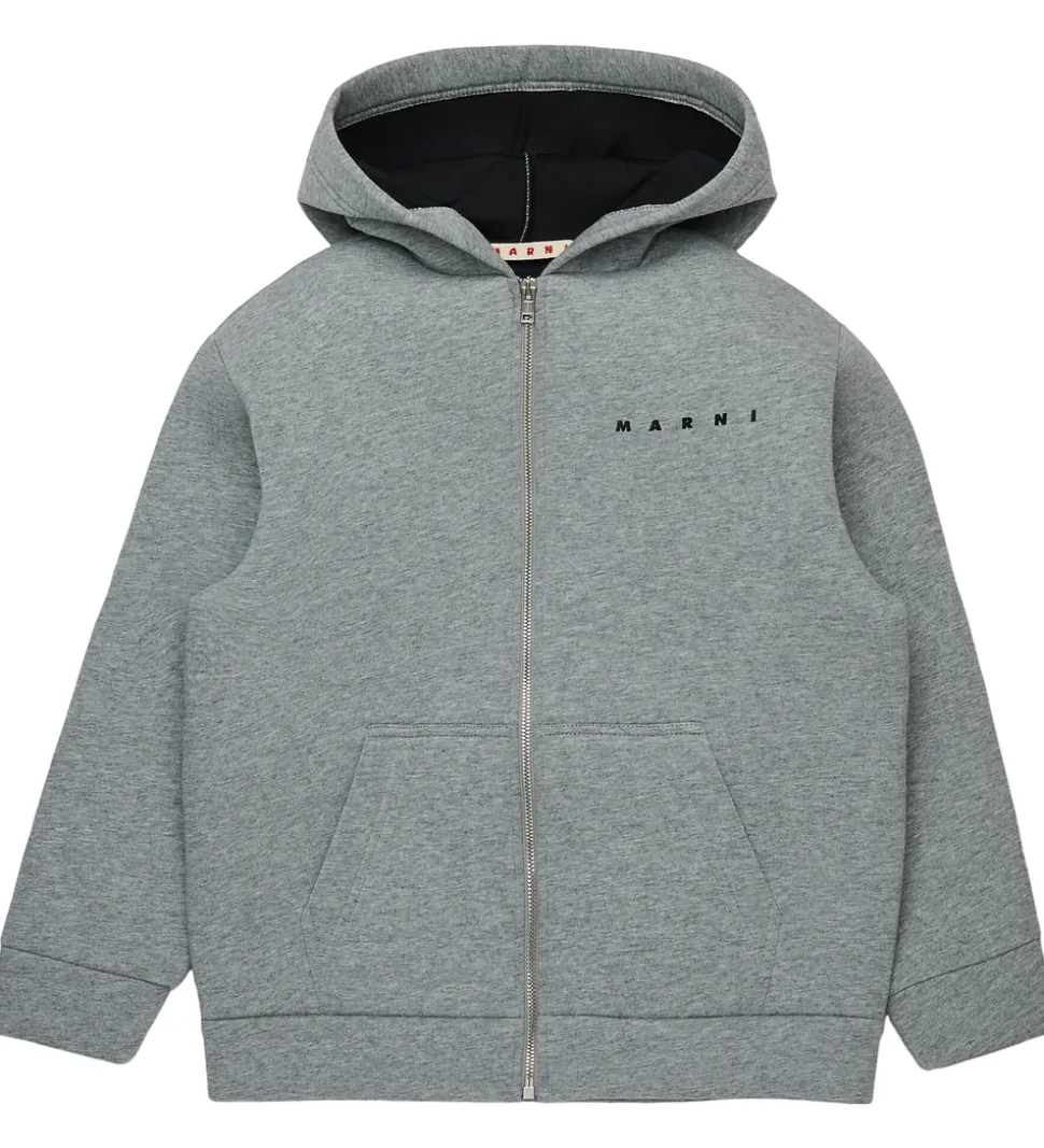 Marni jakken har en fast hætte, og den har brede kanter. Jakken lukkes med en sølvfarvet lynlås, og fortil er der praktiske lommer. Jakken har et for af gråmeleret bomuldsjersey.