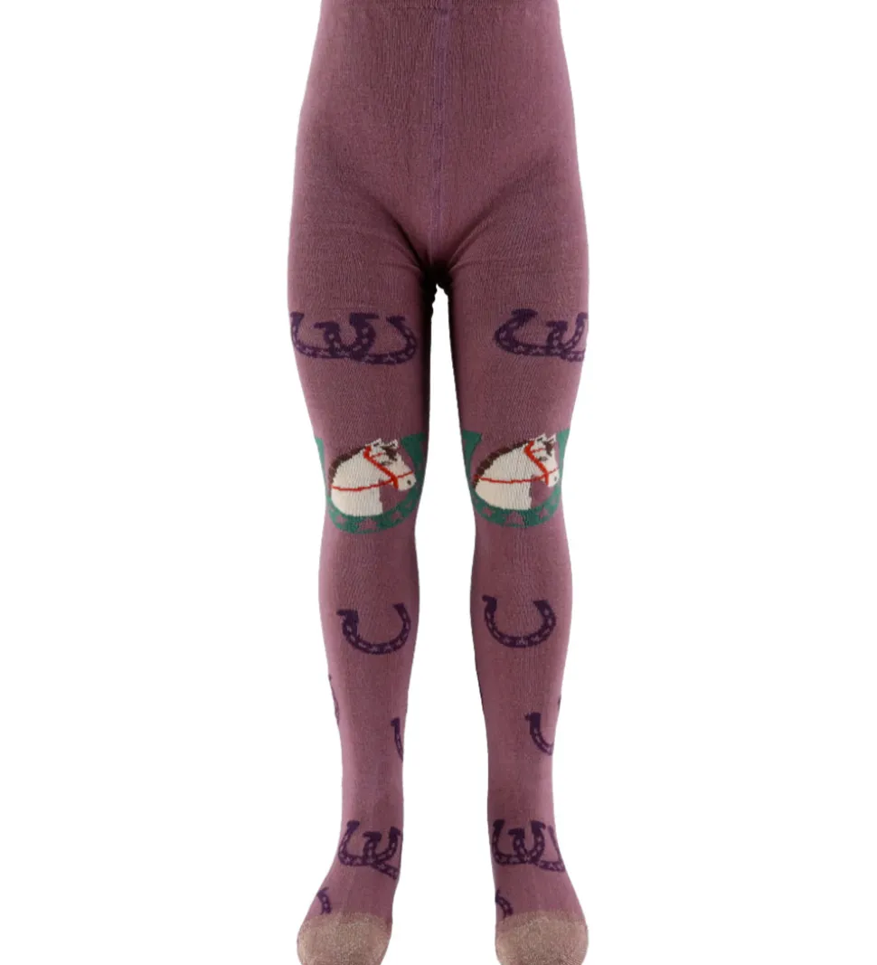 Herlige Melton strømpebukser i lilla med hestesko og hesteprint. Disse strømpebukser har en elastisk talje for en god pasform. Detaljerede illustrationer af heste tilføjer et charmerende præg til Meltons design.