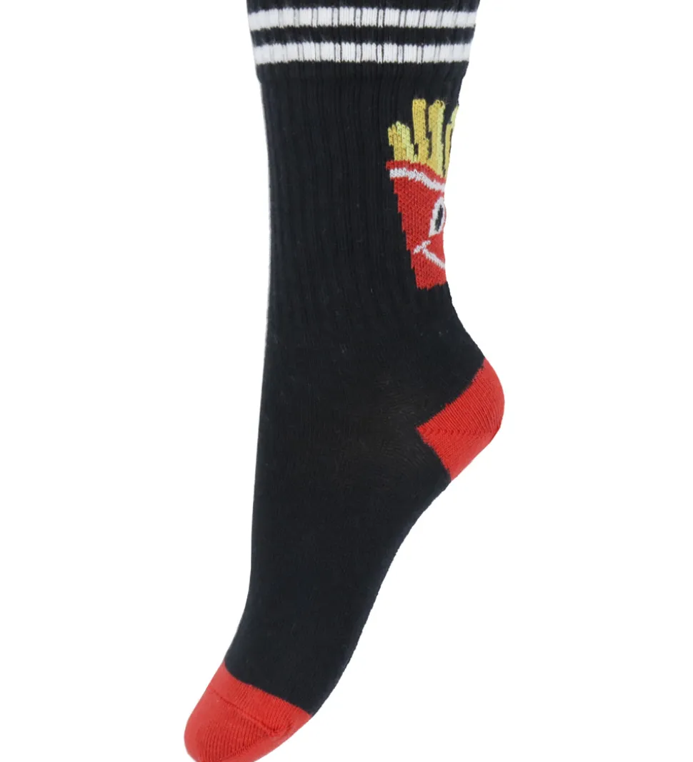 Charmerende Melton strømper i sort, og bag på skaftet er der et print med gule pomfritter i et rødt bæger. Strømperne har et almindeligt længde skaft med ribstruktur som tennisstrømper.