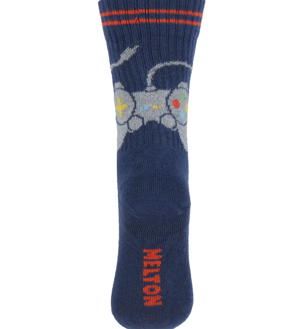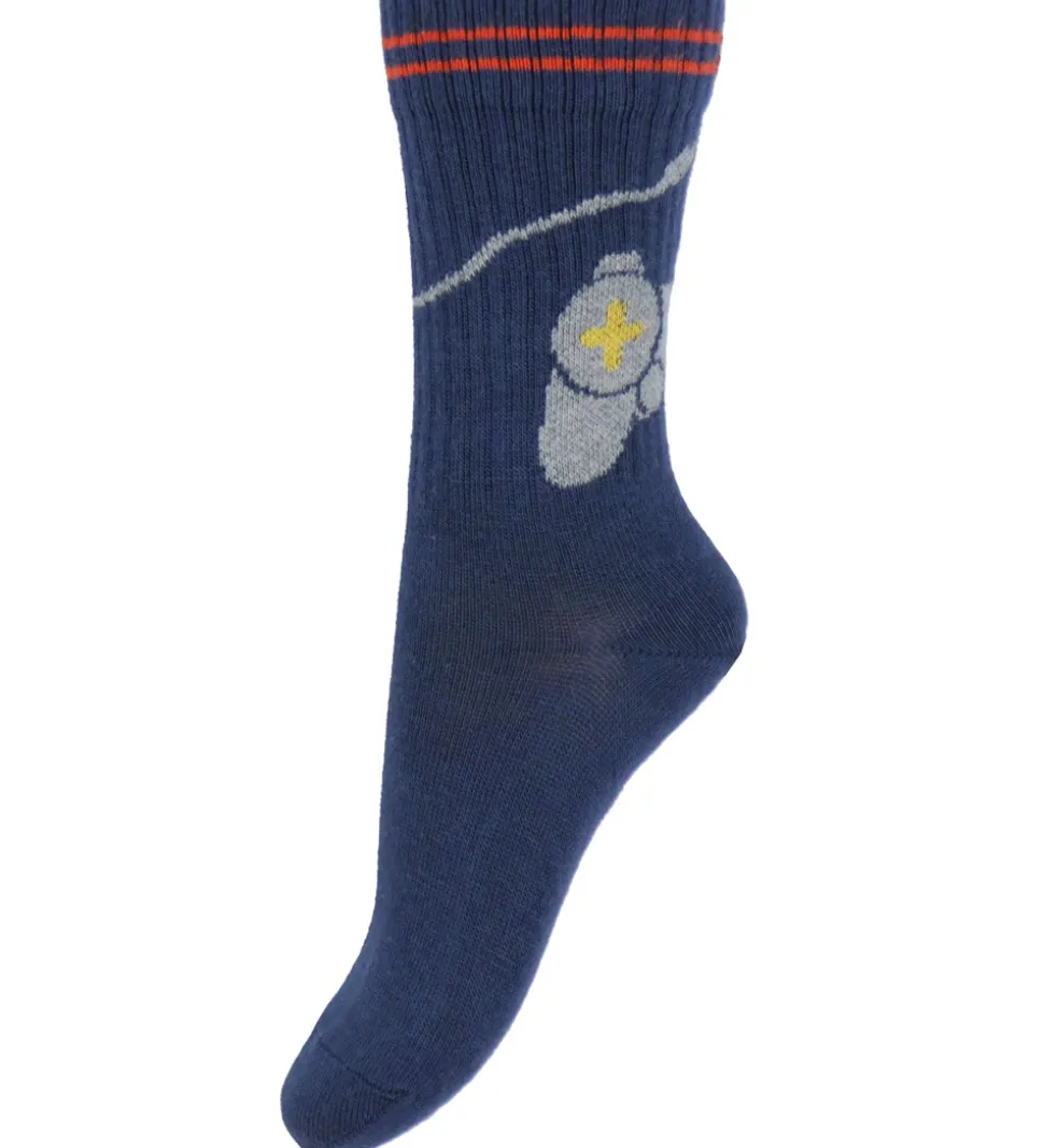 Seje Melton strømper i navy, og bag på skaftet er der en grå controller til en spillekonsol. Strømperne har et almindeligt længde skaft med ribstruktur som tennisstrømper.