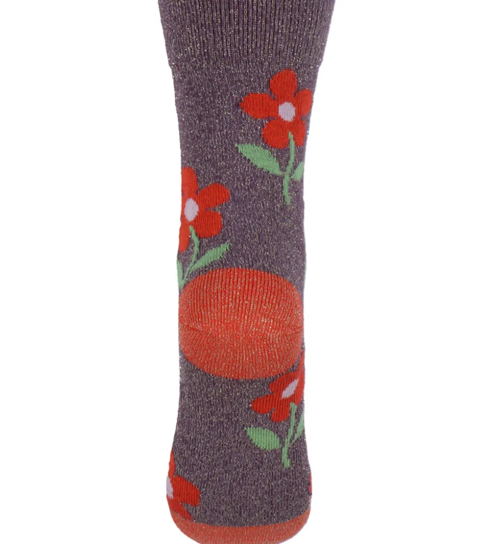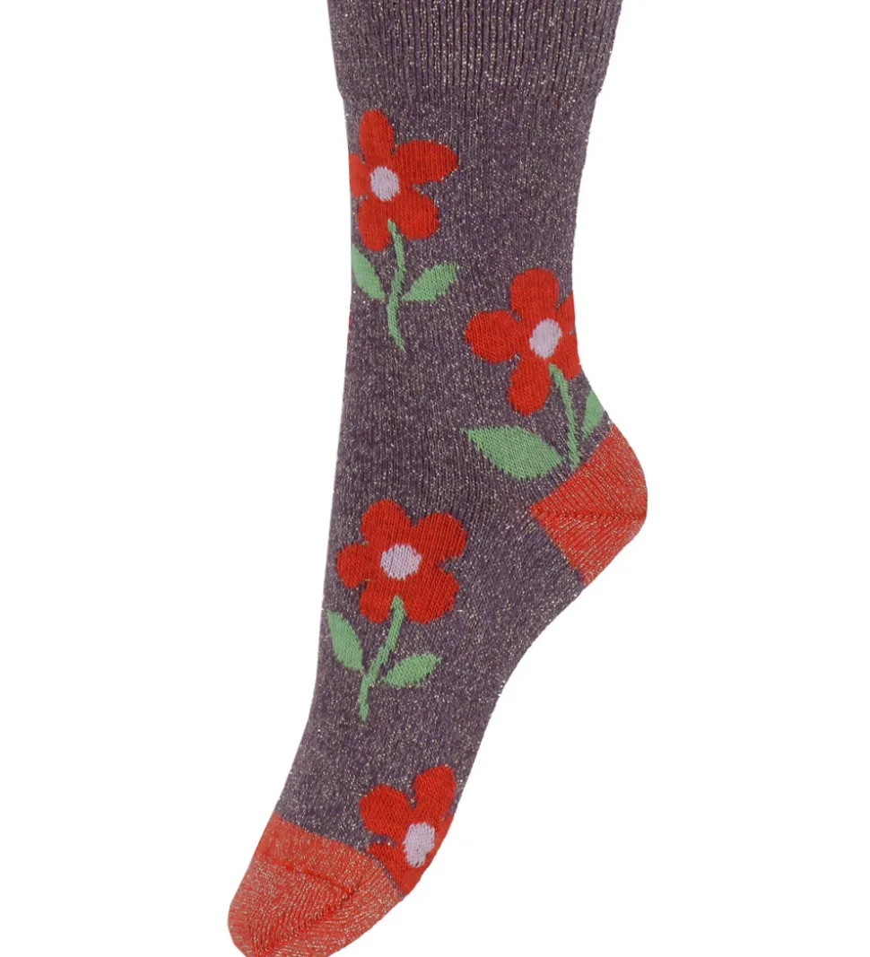 Smukke Melton strømper i lilla med glimmer og med et blomstermotiv i rød og grøn. Strømperne har et almindelit længde skaft og afsluttes med en ribkant øverst.