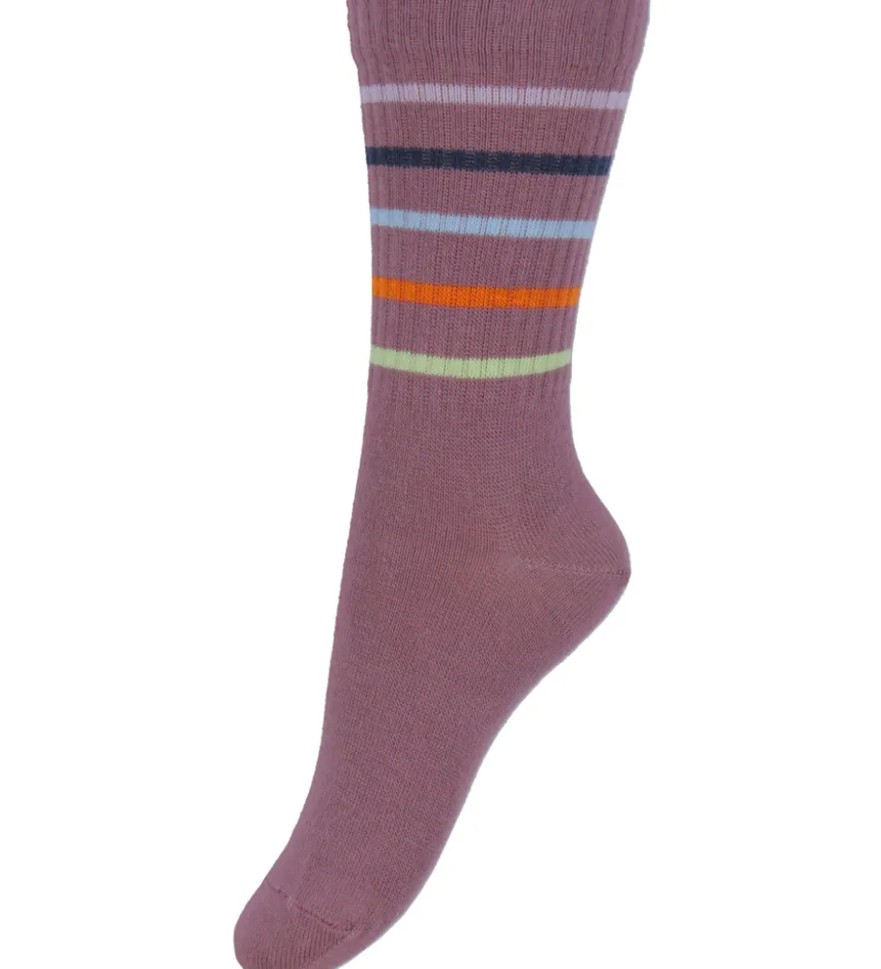 Stilfulde Melton strømper i en flot lilla farve med vandrette, farverige striber. Strømperne har et almindeligt længde skaft med en smal ribkant øverst, der sikrer en god pasform. Melton står for kvalitet og enkelhed.