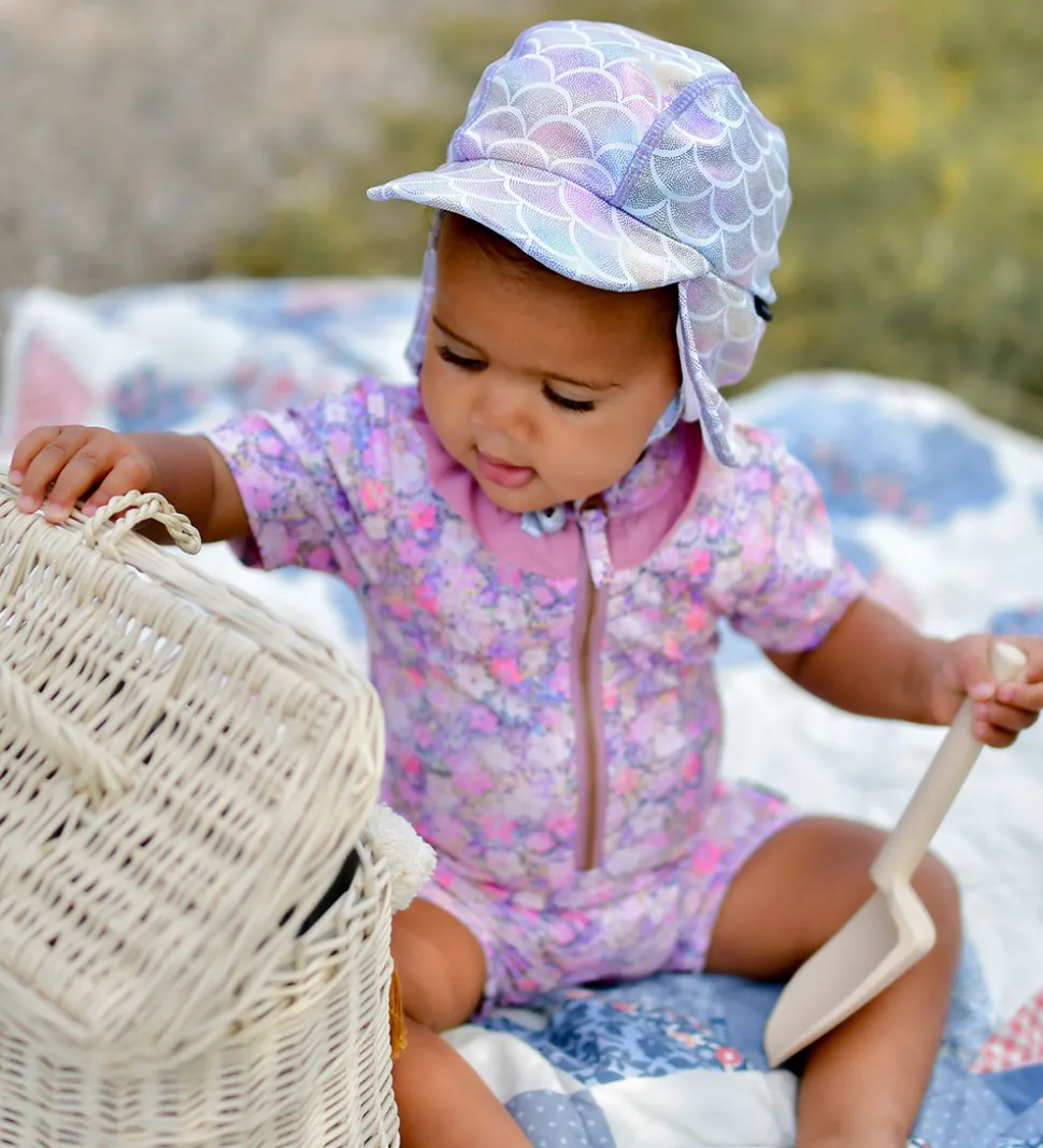 Skøn Mikk-Line badehat i lys lilla med et farverigt havefrue-skæl print med en metallisk effekt.