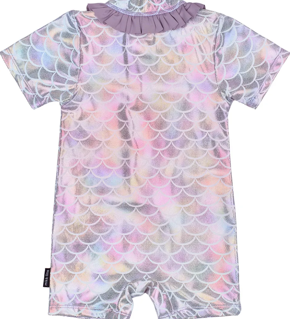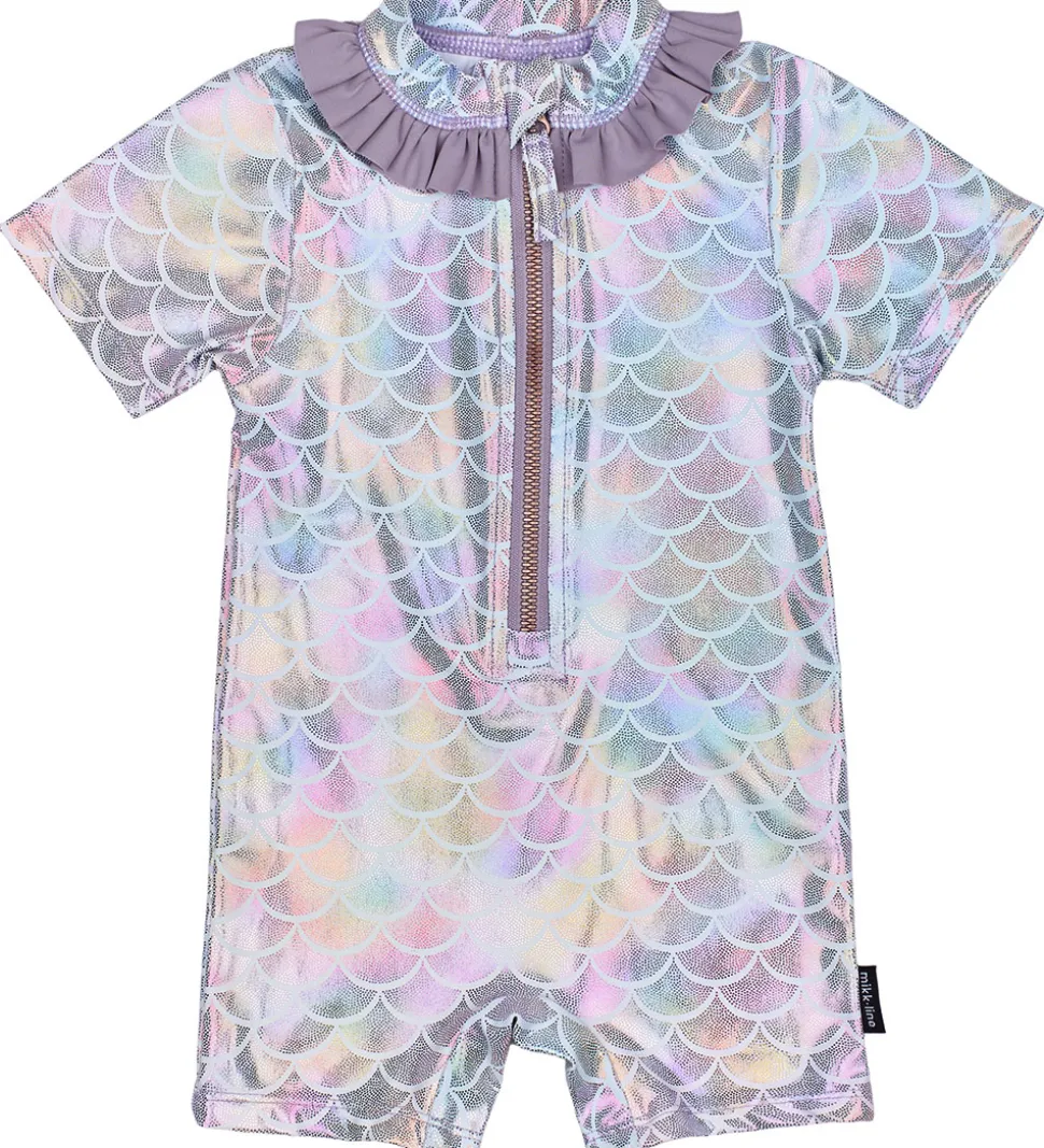 Skøn Mikk-Line badeheldragt i en smuk farve med et metallisk print af havfrue-skæl. Badeheldragten har korte ærmer og ben og har en praktisk lynlås fortil samt en flæsekant ved halsen for et sødt og hyggeligt look.