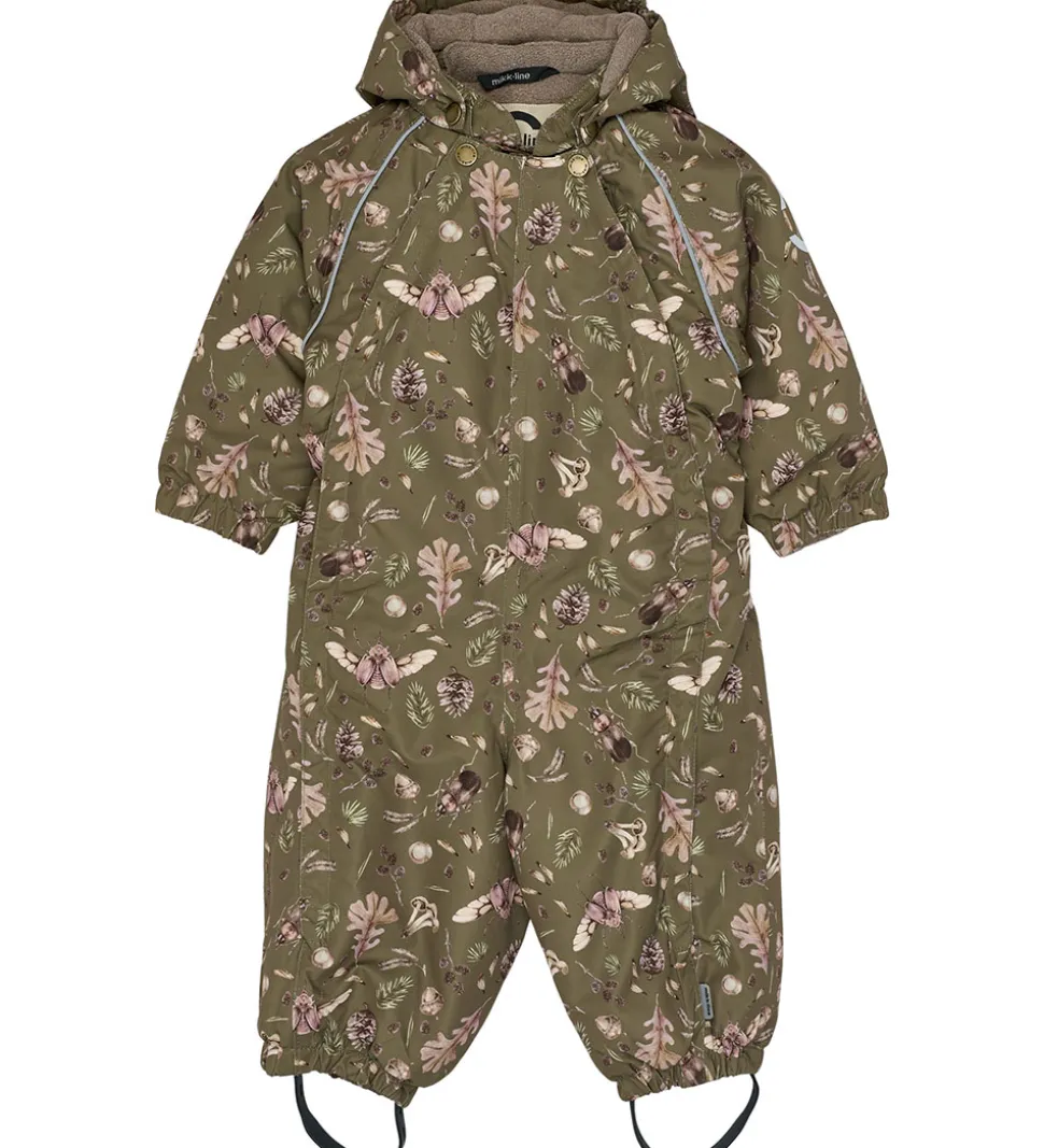 Fin Mikk-Line flyverdragt i mørkegrøn med et alloverskovprint med biller og blade i brune nuancer. Flyverdragten har praktiske refleksdetaljer langs skuldrene, på venstre ærme og langs oversiden af hætten.