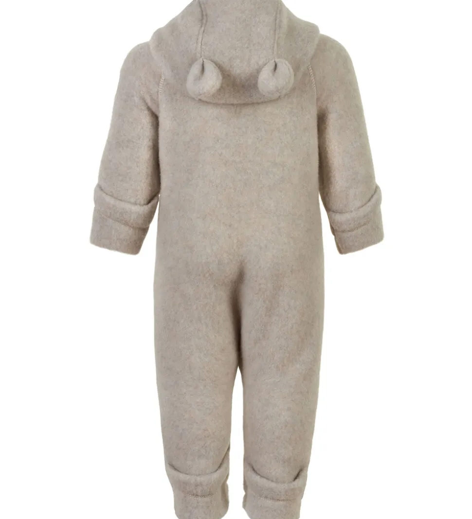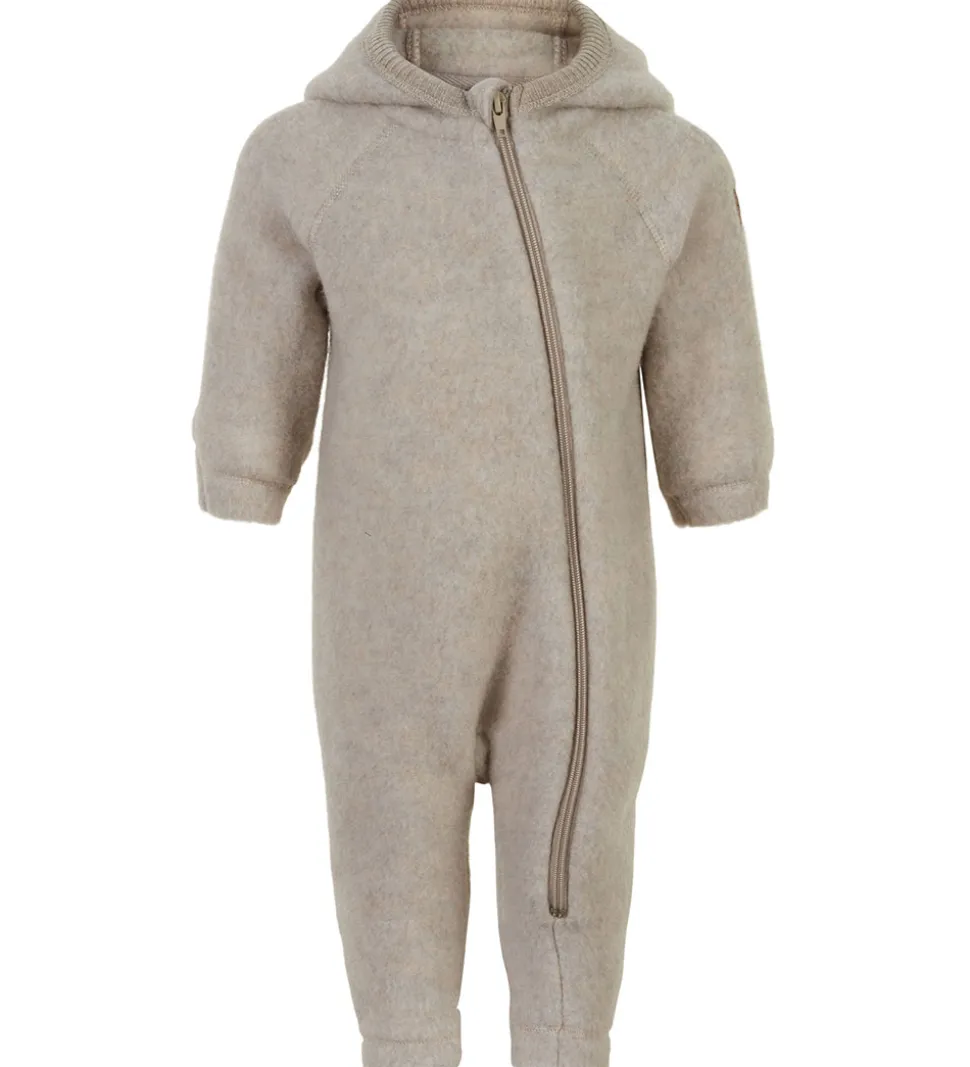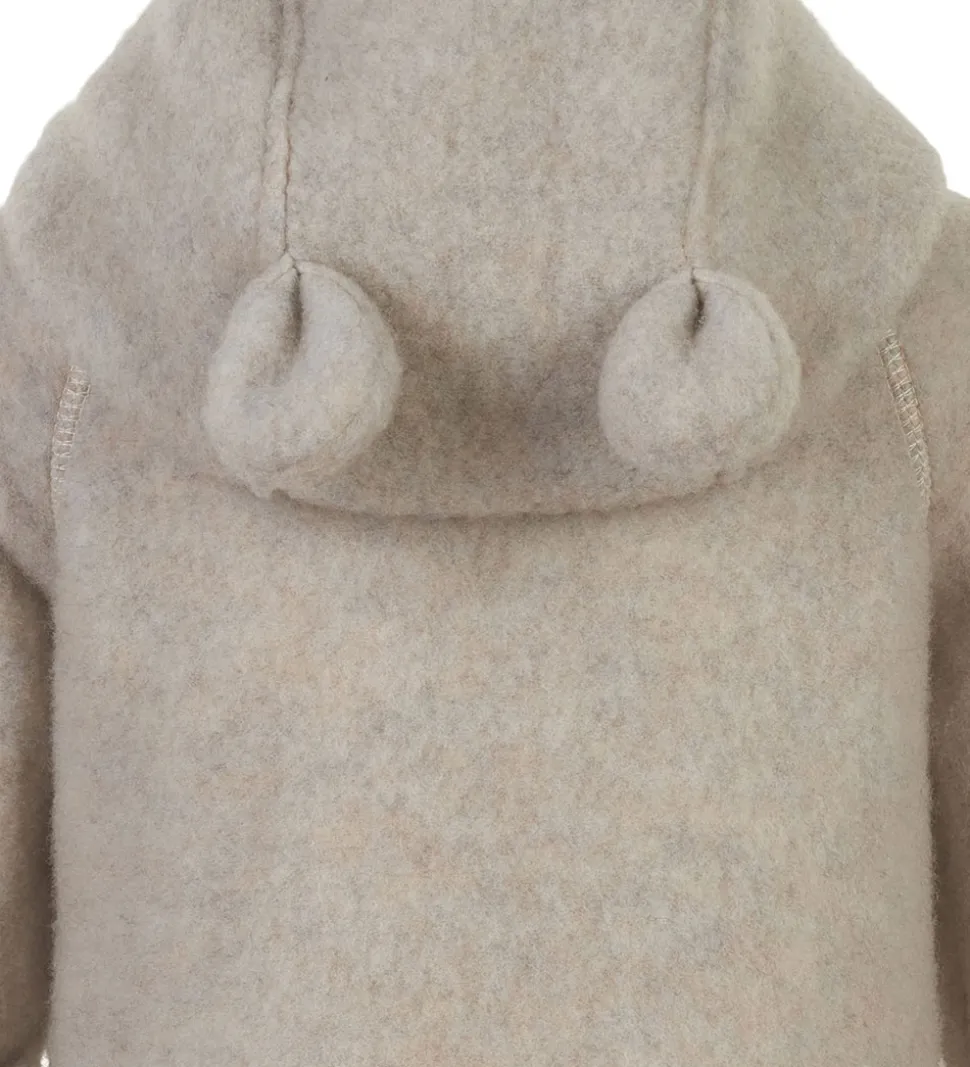 Skøn Mikk-Line køredragt af filtet uld i meleret cremehvid. Øverst på venstre ærme er der et brunt lædermærke med et Mikk-Line-logo.