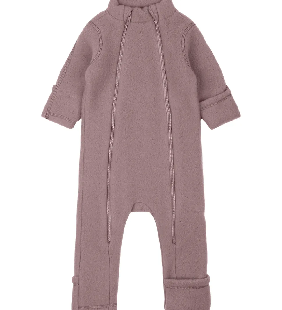 Hyggelig Mikk-Line køredragt af filtet uld i støvet lilla og med et lille, brunt logo på venstre ærme.