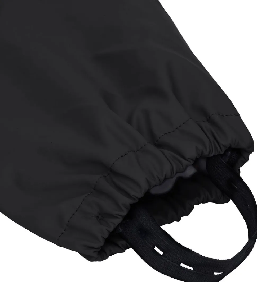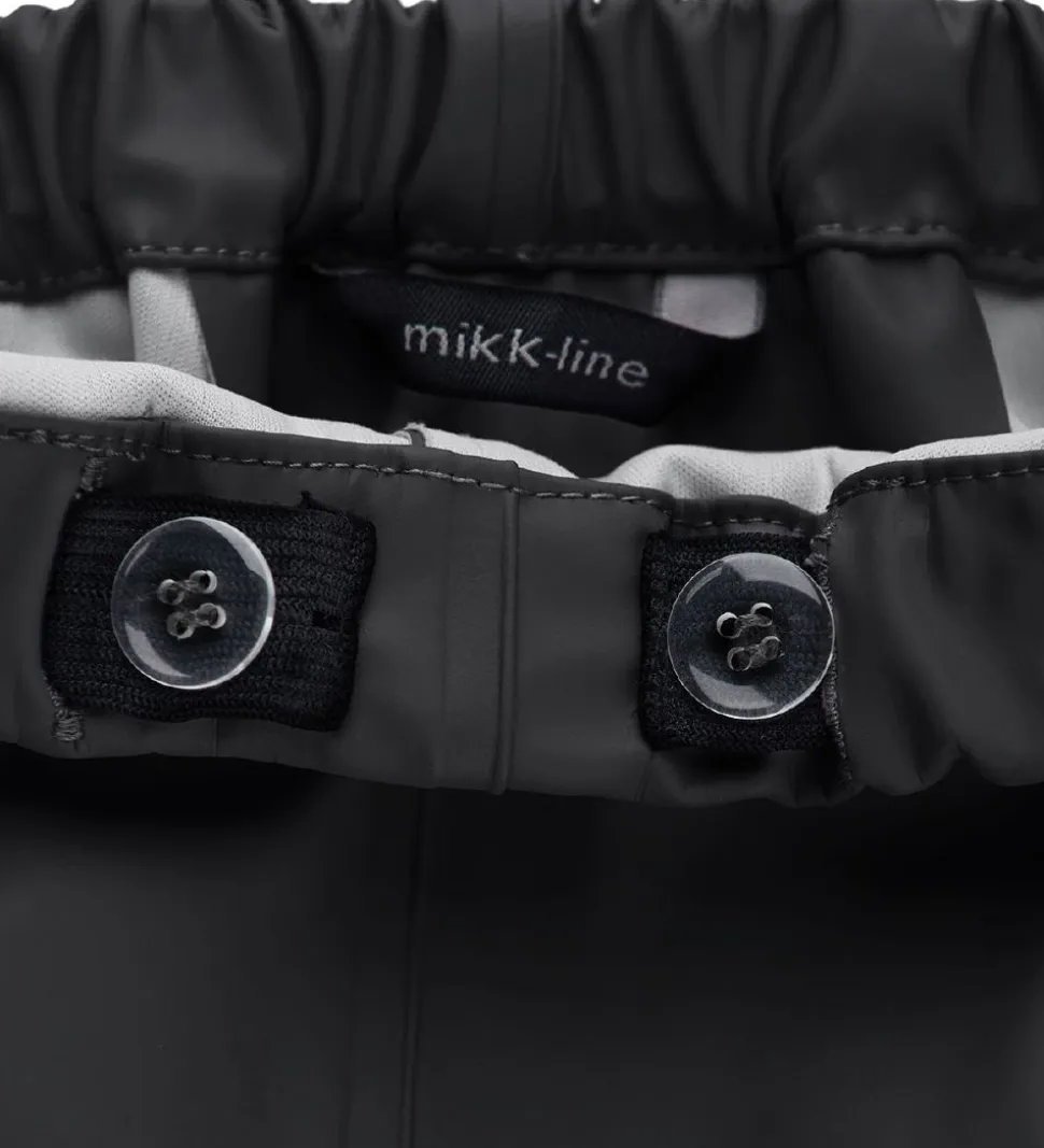 Regnbukserne har en justerbar elastikkant i taljen, ligesom buksebenene også har elastikkanter. Ved anklerne er der justerbare elastikstropper, som kan sættes under gummistøvlerne.