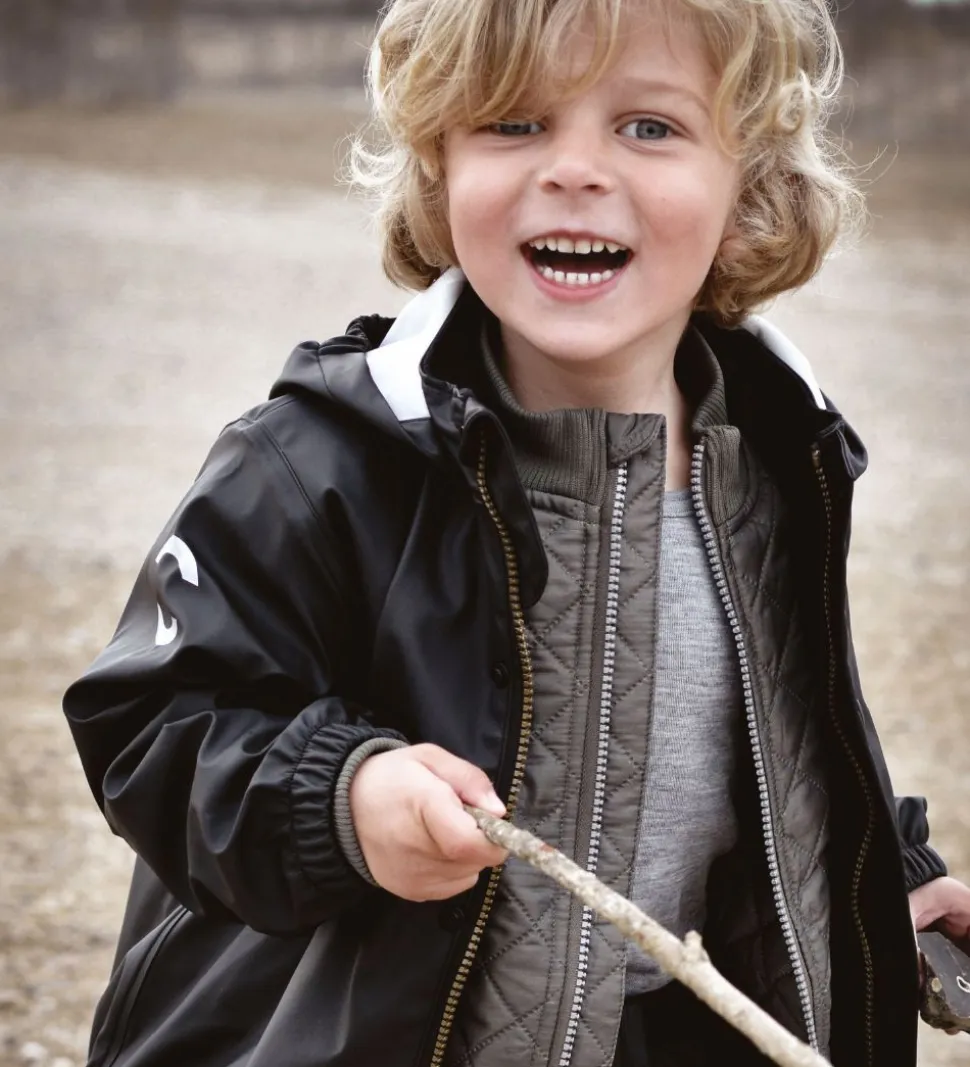 Mikk-Line regnjakken har en aftagelig hætte, der sidder fast med trykknapper. Hætten har en elastikkant i begge sider af ansigtsåbningen, så den sidder tæt til, og i halskraven er der foret med blødt, gråt fleece. Der er elastikkanter ved håndleddene, og i bunden er der elastikkanter i siderne. Regnjakken åbnes fortil ved hjælp af en lynlås med udvendig vindstolpe, som lukkes til med trykknapper.
