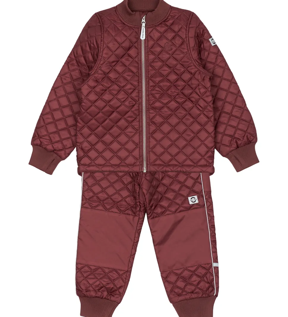 Lækkert Mikk-Line termotøj bestående af en termojakke og et par termobukser i ensfarvet støvet rød.
