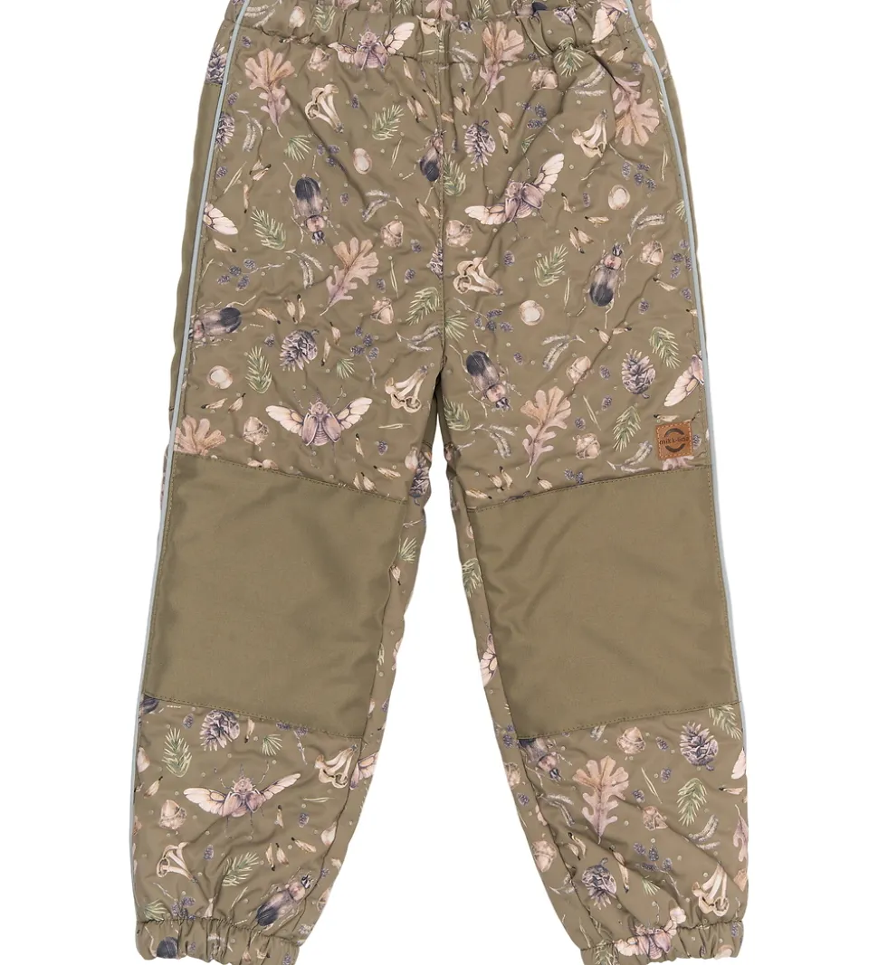 Skønt Mikk-Line termotøj bestående af en termojakke og et par termobukser i grøn med et alloverprint af insekter, blanter og blade i brune nuancer med et indpræget prikmønster, der laver en flot struktur.