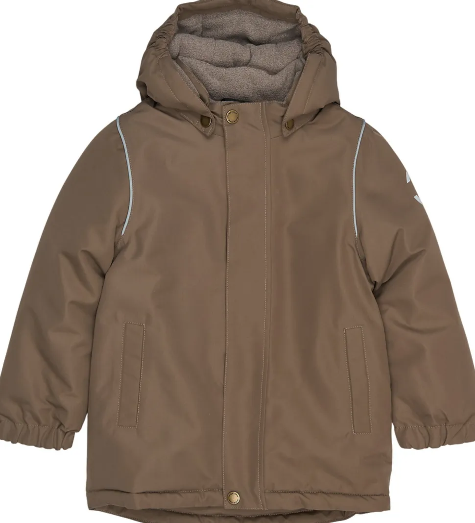 Pæn Mikk-Line vinterjakke i lysebrun. Vinterjakken har refleksdetaljer på hætten, nederst på ryggen og omkring skuldrene.