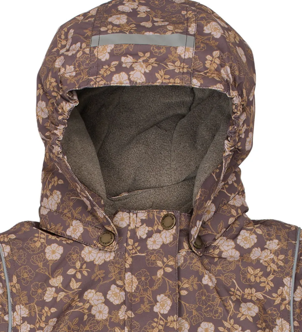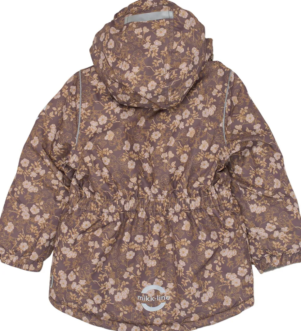 Pæn Mikk-Line vinterjakke i en mørk, støvet lilla farve og med et alloverblomsterprint i guld og beige. Vinterjakken har refleksdetaljer på hætten, nederst på ryggen og omkring skuldrene.