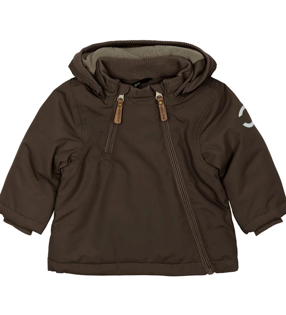 Dejlig Mikk-Line vinterjakke i mørkebrun med refleksdetaljer på venstre ærme og nederst på ryggen.