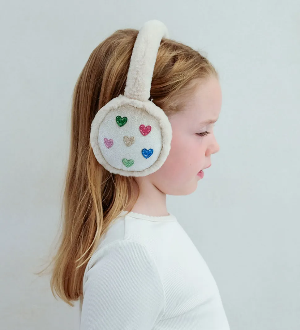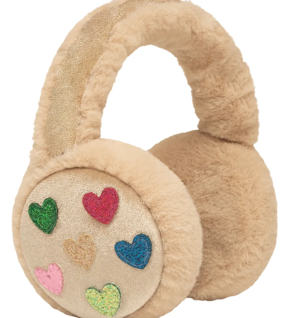 Charmerende Mimi & Lula hue i en lysebrunt fleece, og på ørerne der dekoreret med glimmerhjerter i forskellige farver som grøn, pink og blå. Den behagelige struktur på ørevarmerne gør Mimi & Lula perfekt til at skabe et stilfuldt udtryk.