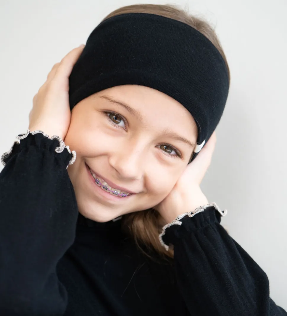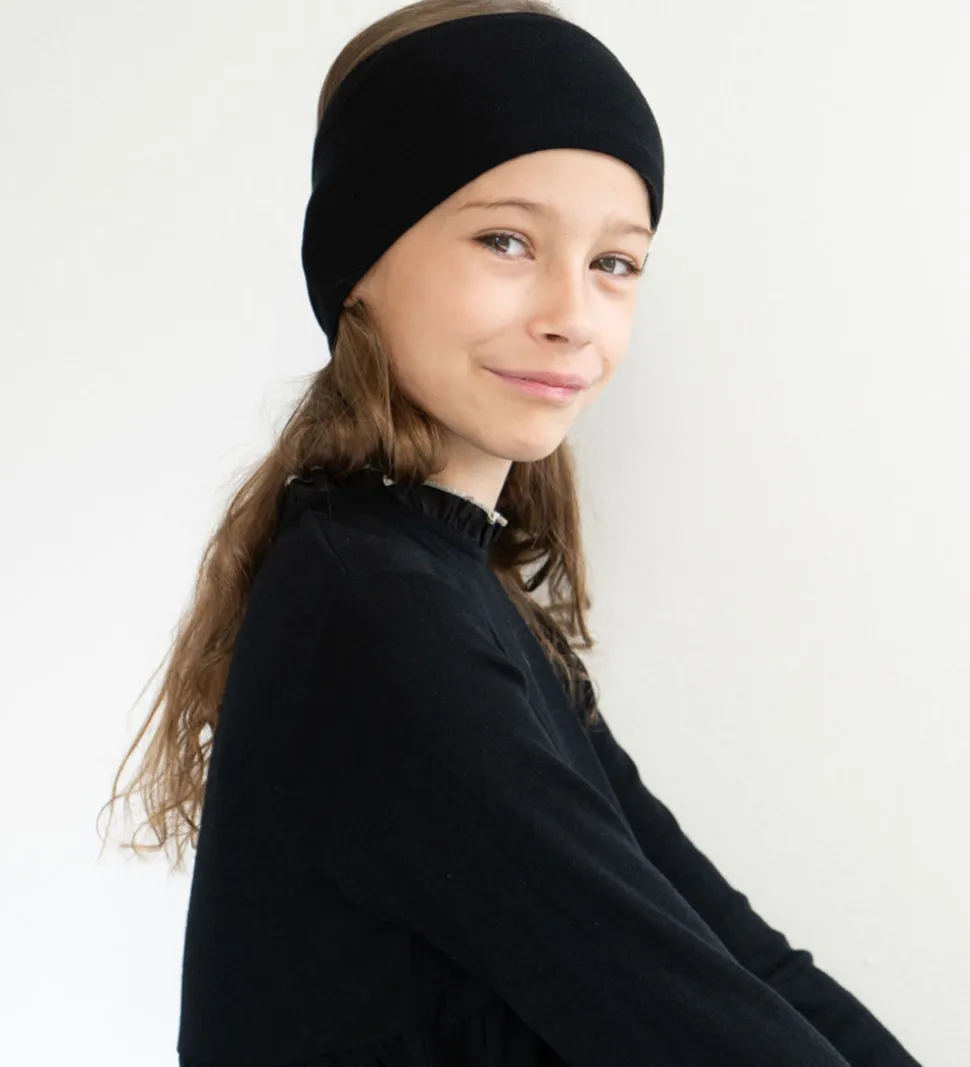 Praktisk Minimalisma pandebånd i ensfarvet sort med ribstruktur, og det er lavet af blødt merinould. Minimalisma pandebåndet er bredt og består af to lag, så det luner ørerne dejligt.