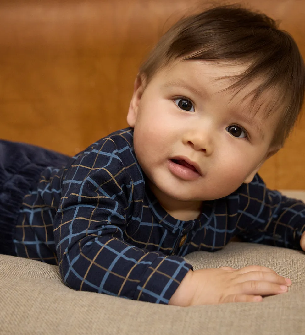 Elegant Minymo body i mørkeblå med ternet mønster i blå og brun. Bodyen har fine, brune knapper fortil og lange ærmer. Den lukkes mellem benene med trykknapper.
