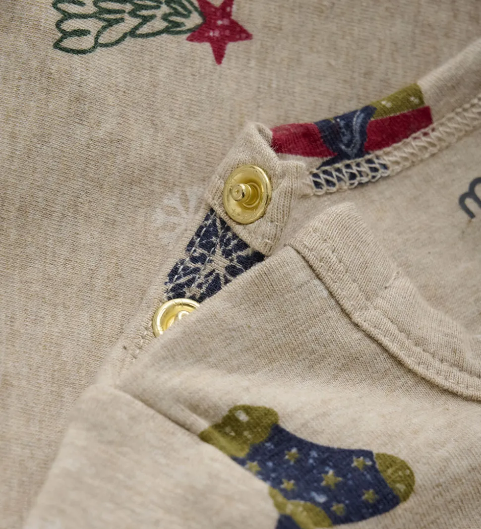 Festlig Minymo body i meleret beige med juleprint. Bodyen har en rund halsudskæring med trykknapper ved skuldrene og lange ærmer. Den lukkes med trykknapper mellem benene.