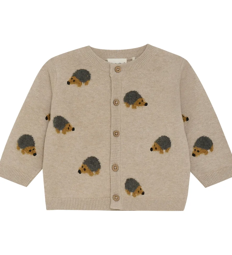 Charmerende Minymo cardigan i en lys beige nuance med lange ærmer. Minymo cardiganen har et fint pindsvinemønster spredt over fronten og ærmerne. Den har en knaplukning foran med praktiske trækknapper.