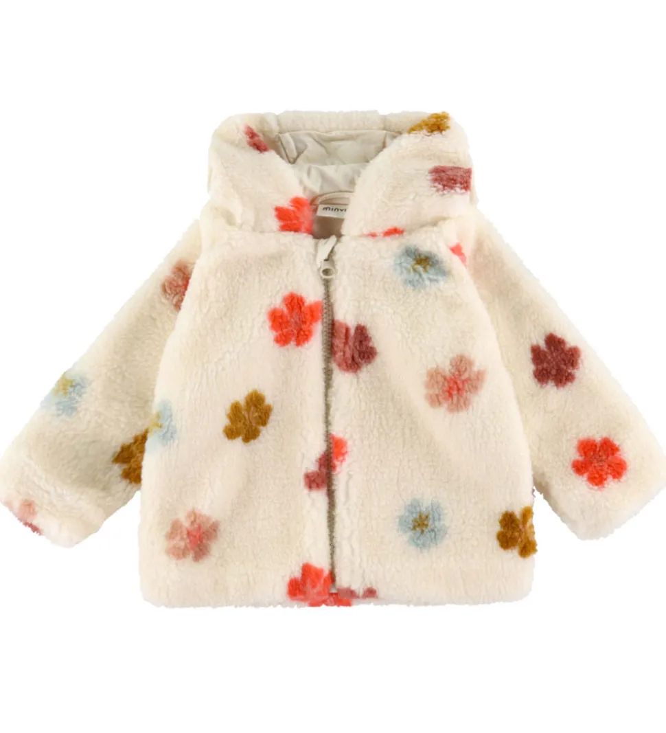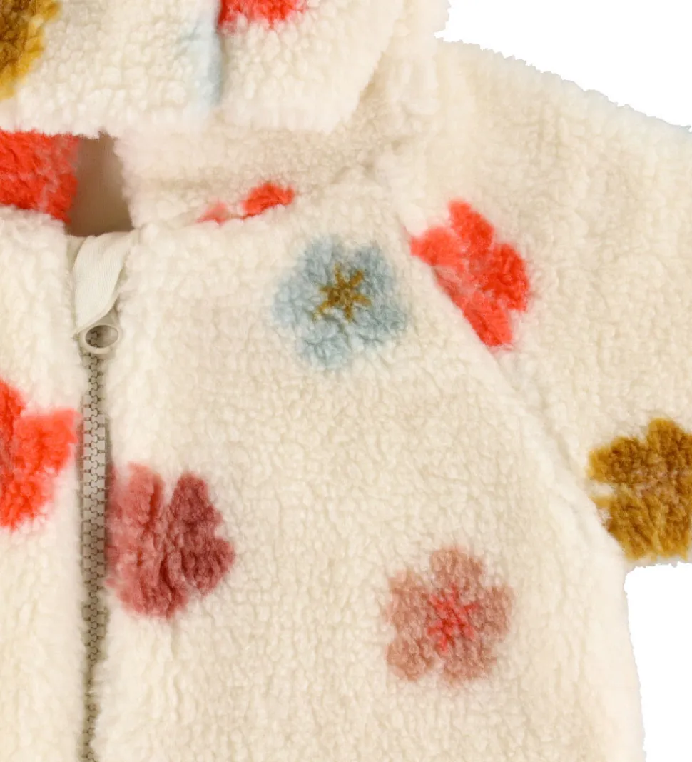 Flot Minymo fleecejakke i hvidt teddyfleece med smukke blomster i alsidige farver som orange, brun, lyseblå og neoorange.