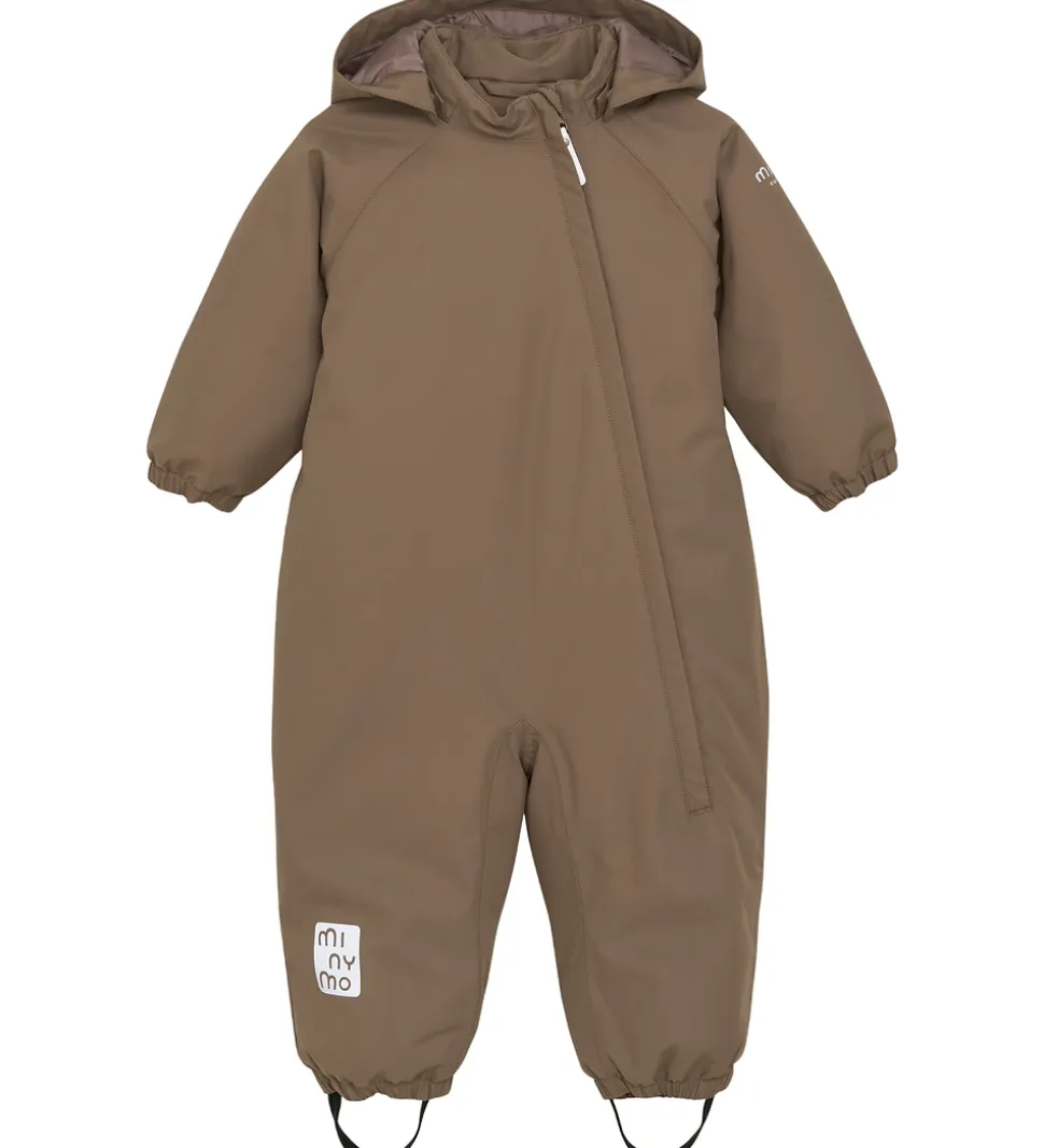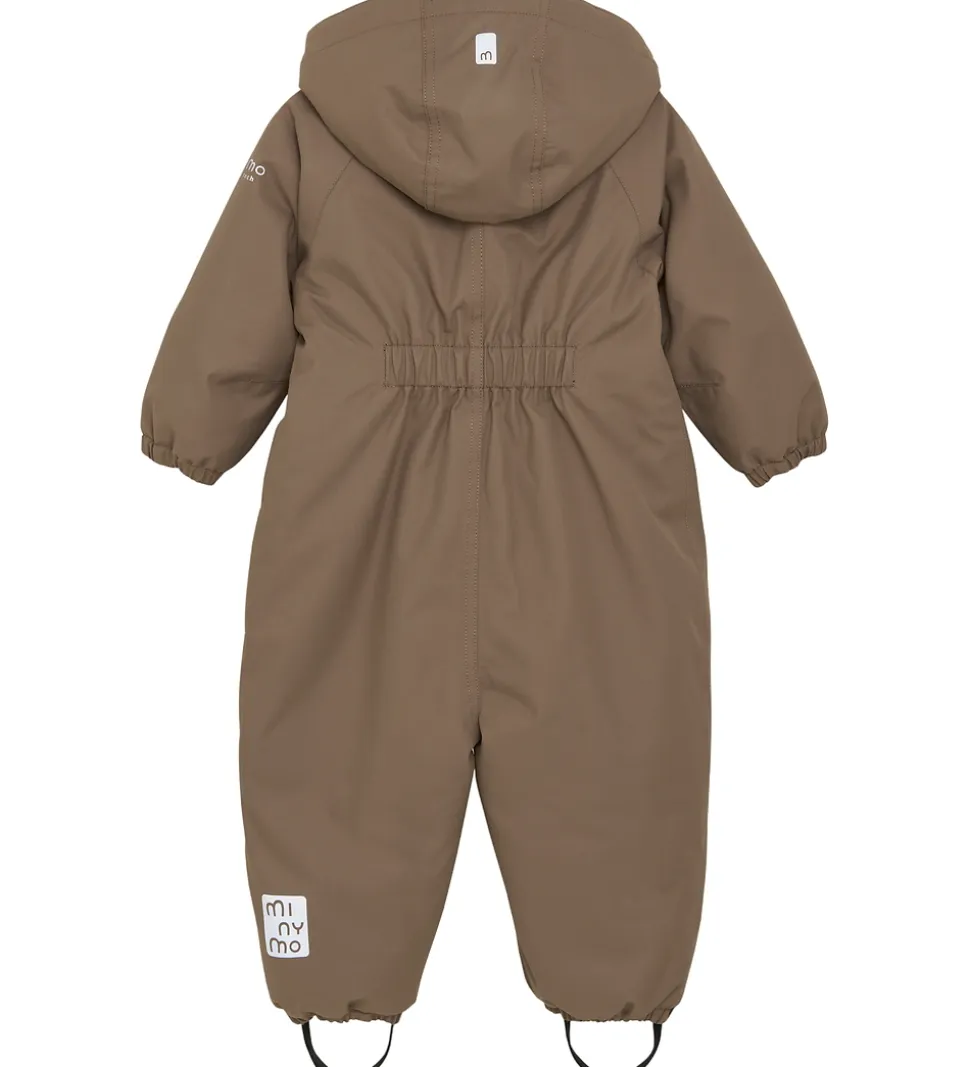 Dejlig Minymo flyverdragt i brun med flere velplacerede refleksprint og -detaljer.