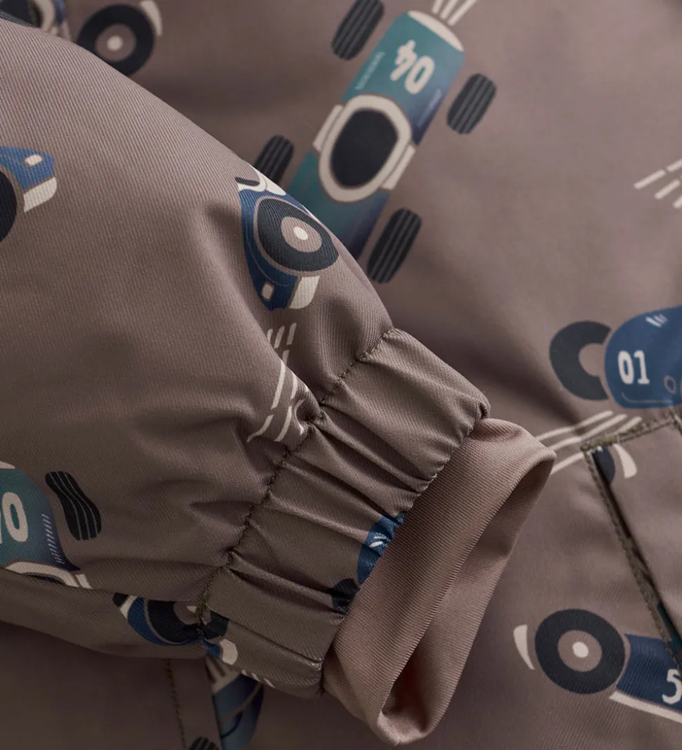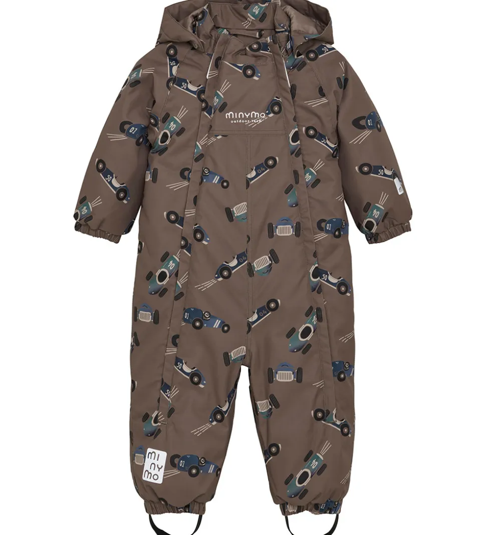 Smart Minymo flyverdragt i brun med et alloverprint af racerbiler i blå og grønne nuancer. Flyverdragten har praktiske refleksdetaljer.