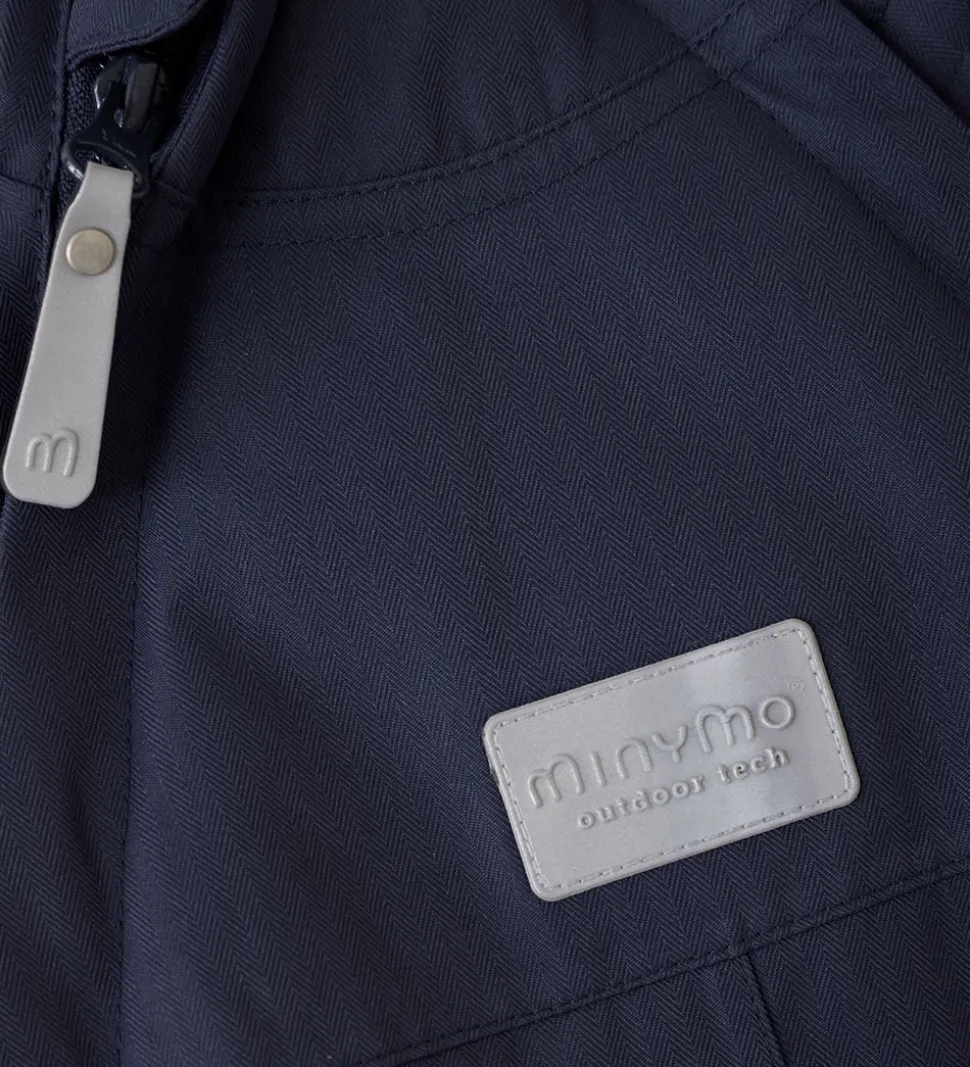 Minymo flyverdragten har en aftagelig hætte, der fæstnes med trykknapper langs halskraven. Ærmerne har fleeceforede elastikkanter i åbningerne. Benåbningerne har elstikkanter med justerbare, aftagelige støvlestropper i gummi. I lænden er flyverdragten tilpasset med en elastikindsats.