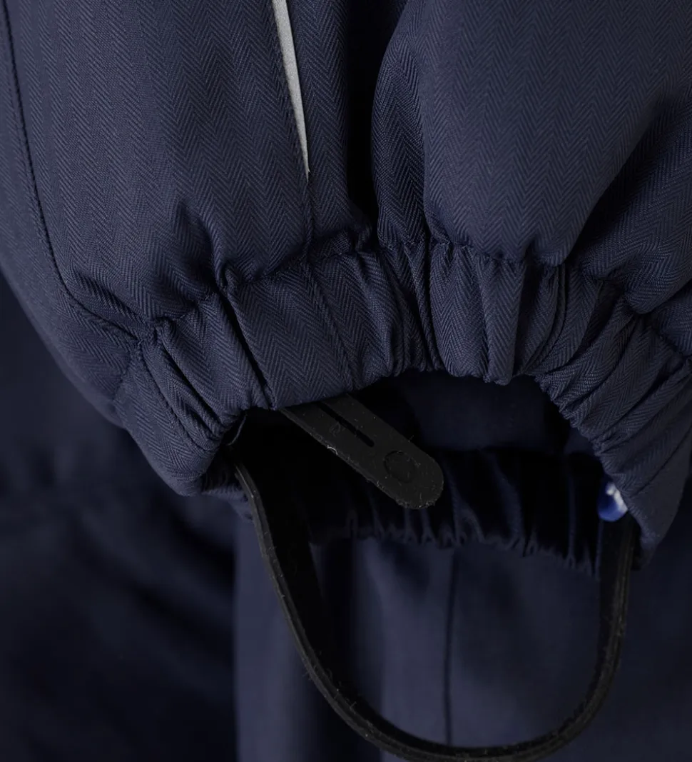 Dejlig Minymo flyverdragt i navyblå med flere velplacerede refleksapplikationer og -detaljer.