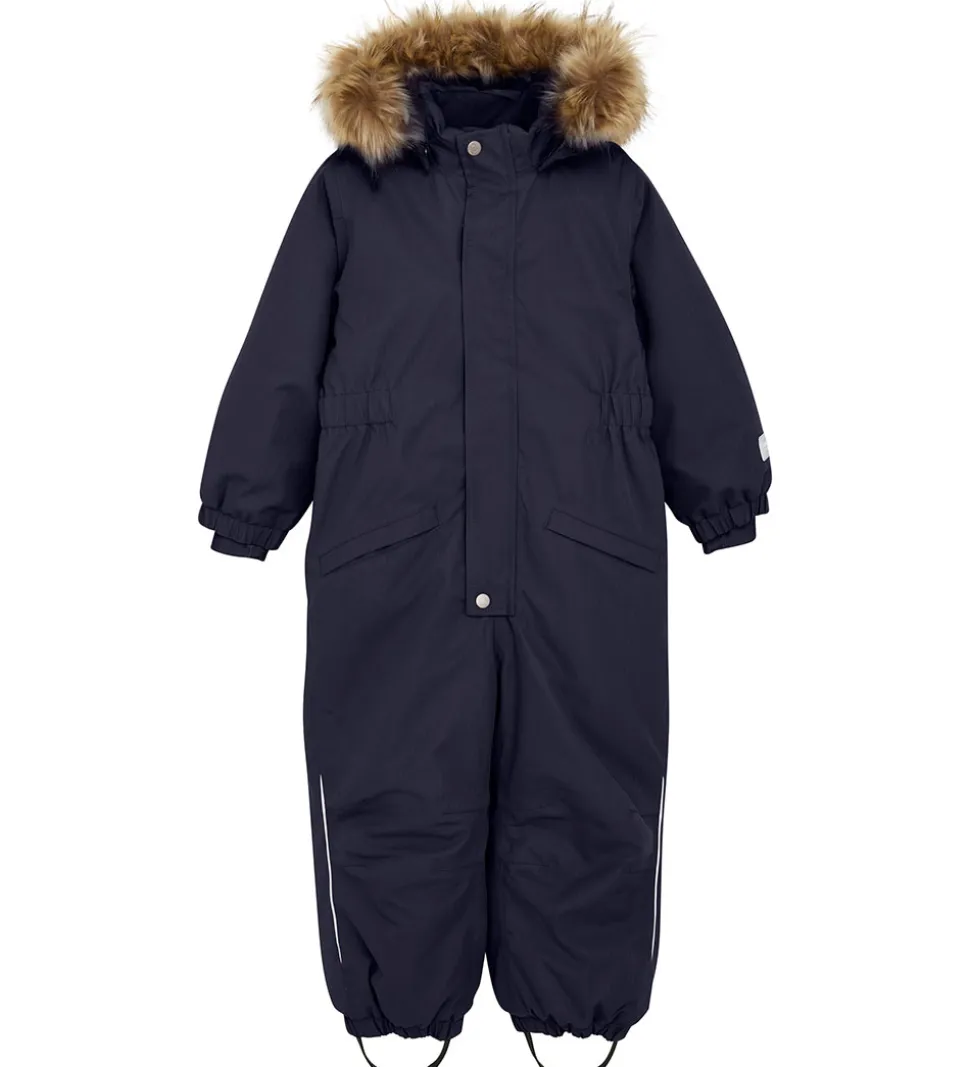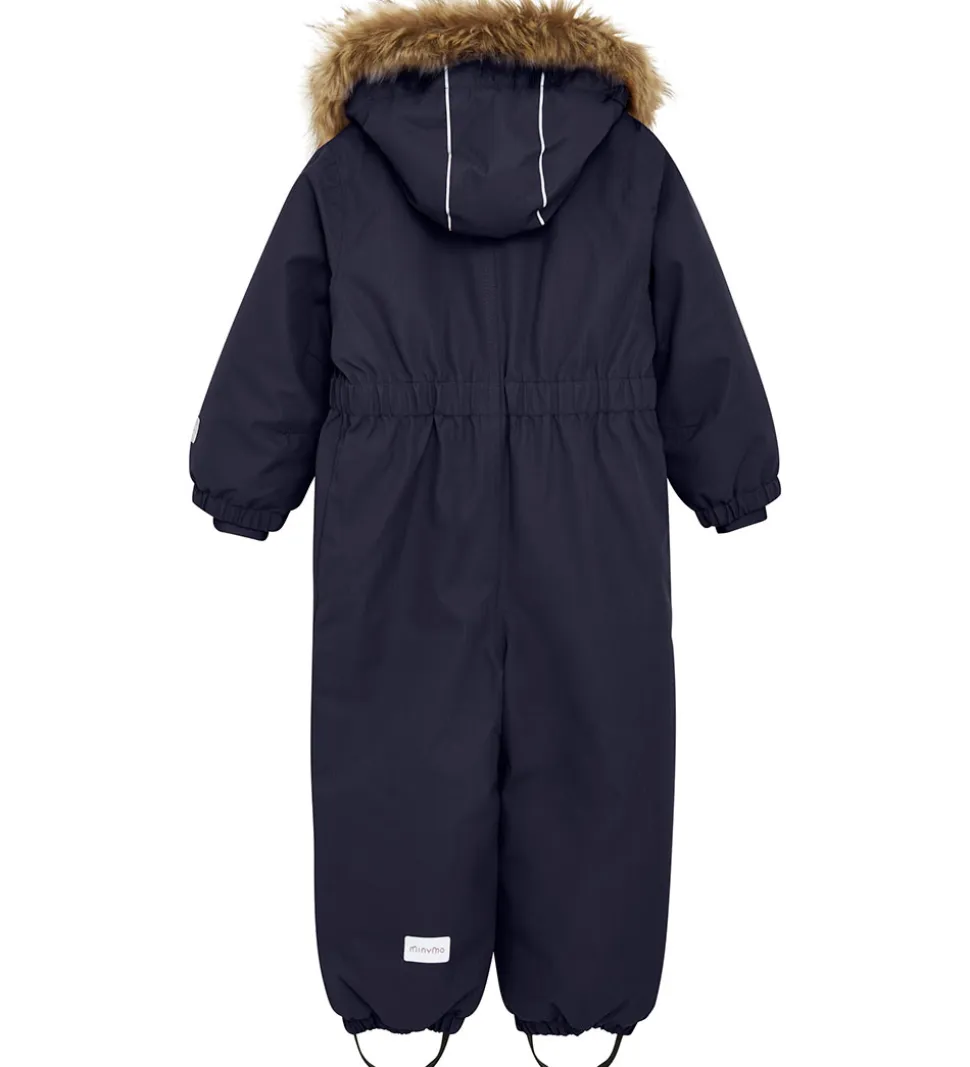 Flot Minymo flyverdragt i mørkeblå med praktiske refleksdetaljer.