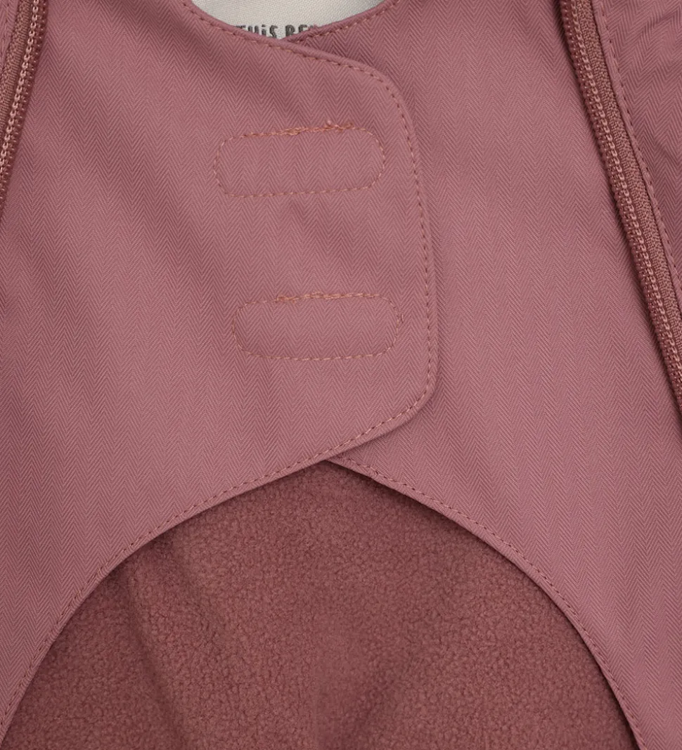 Dejlig Minymo flyverdragt i mørk rosa med flere velplacerede refleksapplikationer og -detaljer.