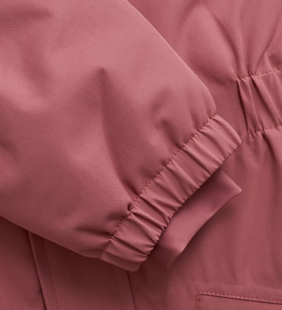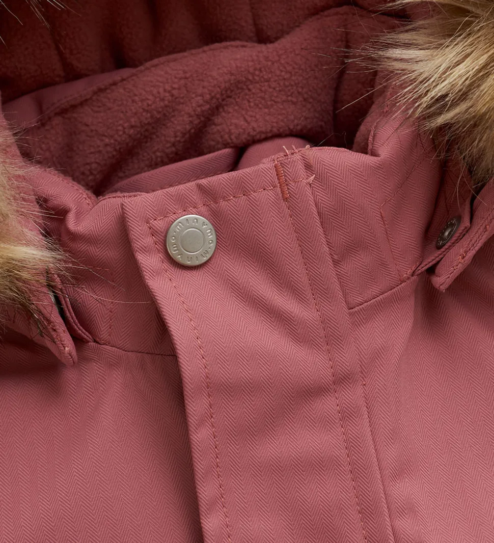 Flyverdragten har en god vattering, og indvendigt er der fleecefor i kroppen og hætten, mens der er glatvævet for i resten af flyverdragten.