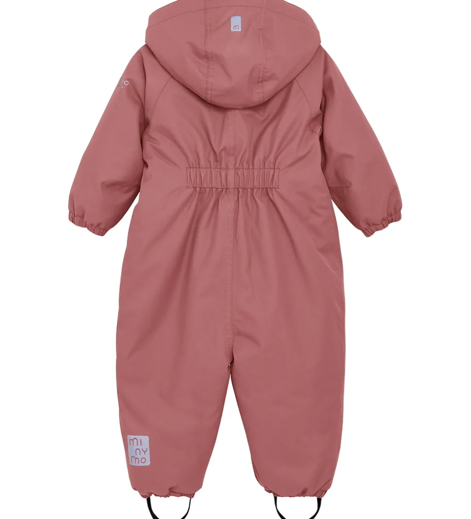 Dejlig Minymo flyverdragt i mørk rosa med flere velplacerede refleksprint og -detaljer.