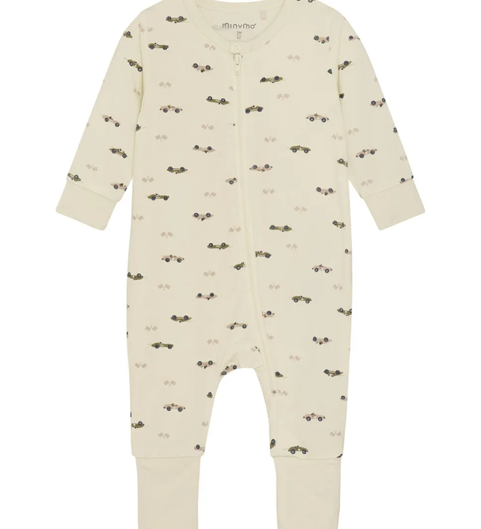 Fin Minymo heldragt i beige med alloverprint af biler.