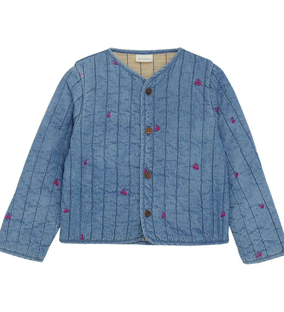 Fin Minymo jakke i blå med små broderede kirsebær i pink. Jakken har en quiltet struktur med vandrette striber og let vattering, så den også kan bruges som en let jakke på varme dage. Den har lange ærmer og gennemgående knapper fortil.