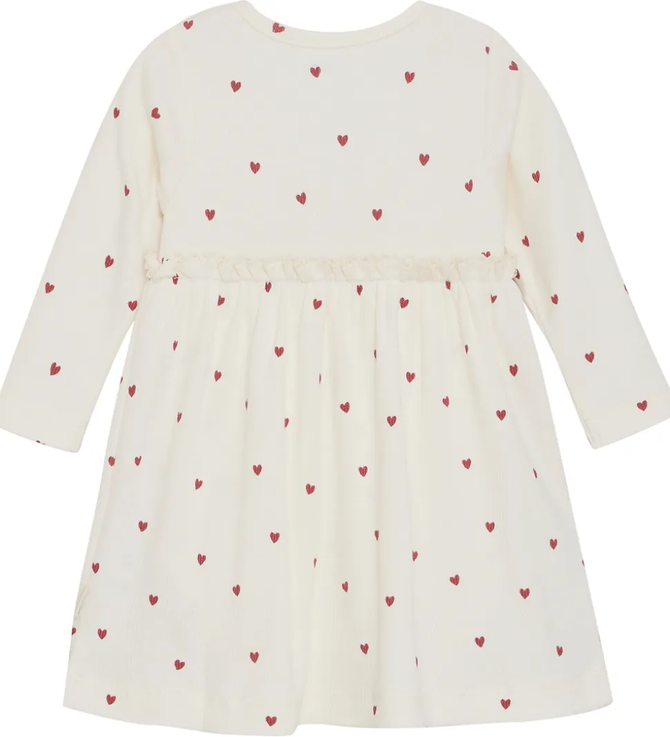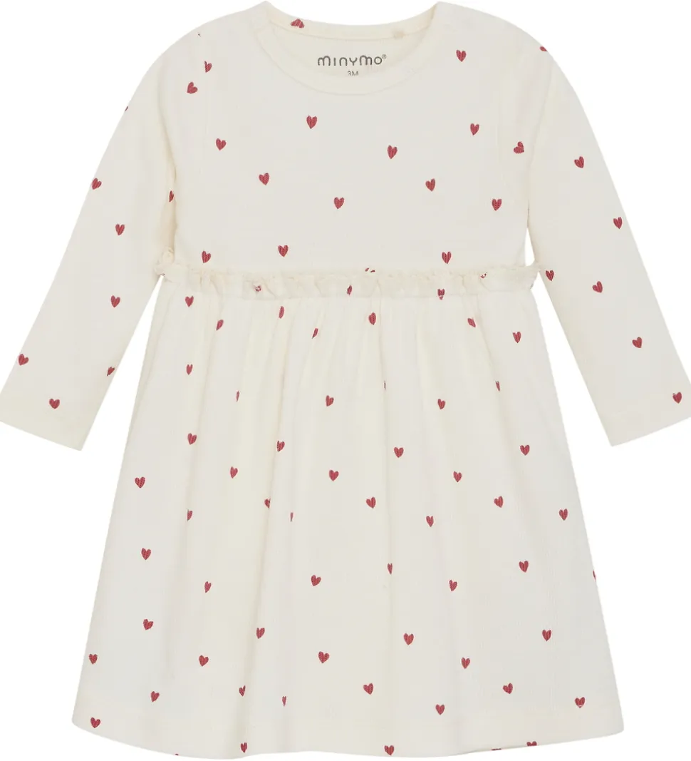 Charmerende Minymo kjolebody i råhvid med et alloverprint af små, røde hjerter. Minymo kjolebodyen har ribstruktur og en fin flæsedetalje under brystet, hvor skørtet får god vidde. Den har lange ærmer og lukkes med trykknapper ved venstre skulder samt mellem benene.