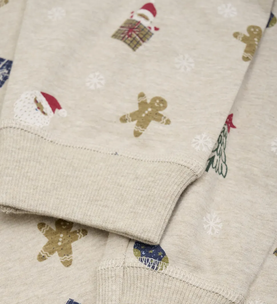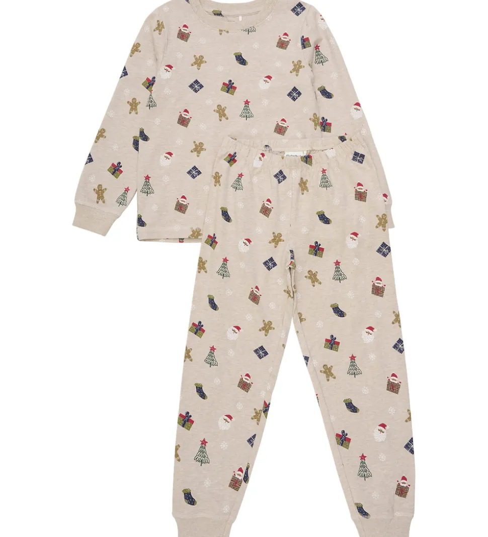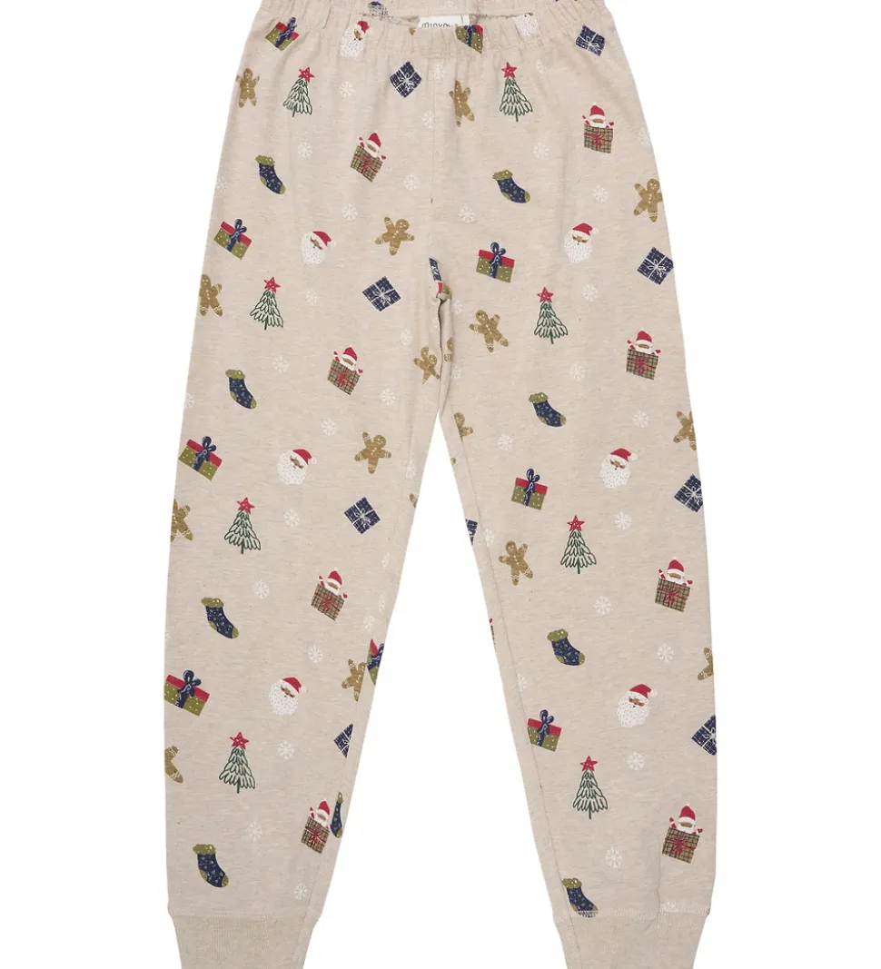 Skønt Minymo nattøj i beige med juleprint af bl.a. nisser, gaver og juletræer i flotte farver. Minymo sættet inkluderer en natbluse med lange ærmer og natbukser med elastik i taljen og rib ved anklerne.