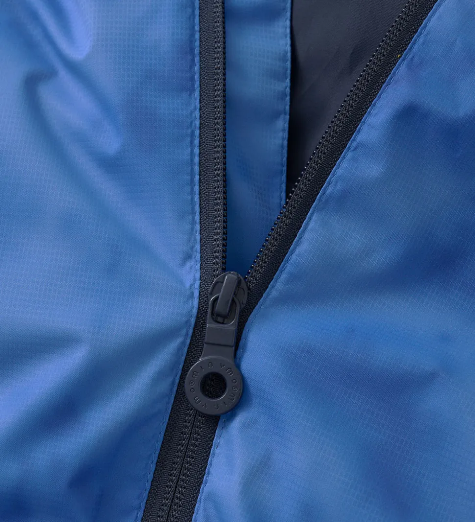 Minymo regnjakken har en aftagelig hætte, som sidder fast med trykknapper, og den har en elastikindsats øverst i ansigtsåbningen. Ærmerne er med praktiske elastikkanter.