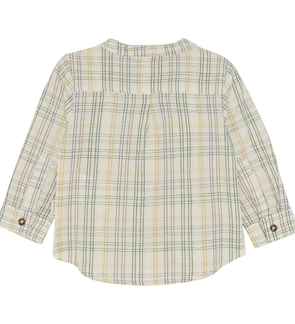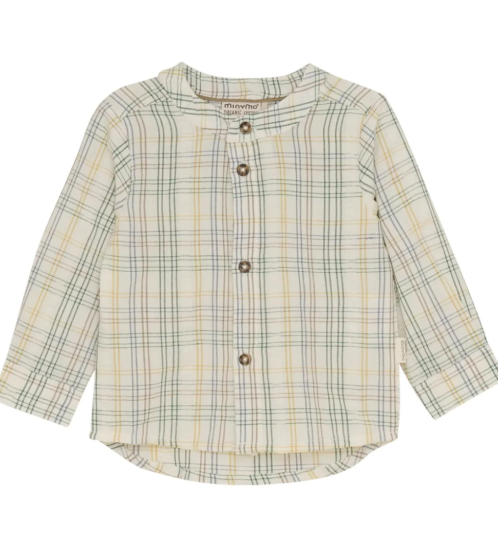 Charmerende Minymo skjorte med et klassisk ternet mønster i nuancer af hvid, grøn og gul. Skjorten har lange ærmer og en rund halsudskæring, der giver et stilrent udtryk. Minymo skjorten er udført i et blødt materiale med knaplukning foran, som sikrer en behagelig pasform.