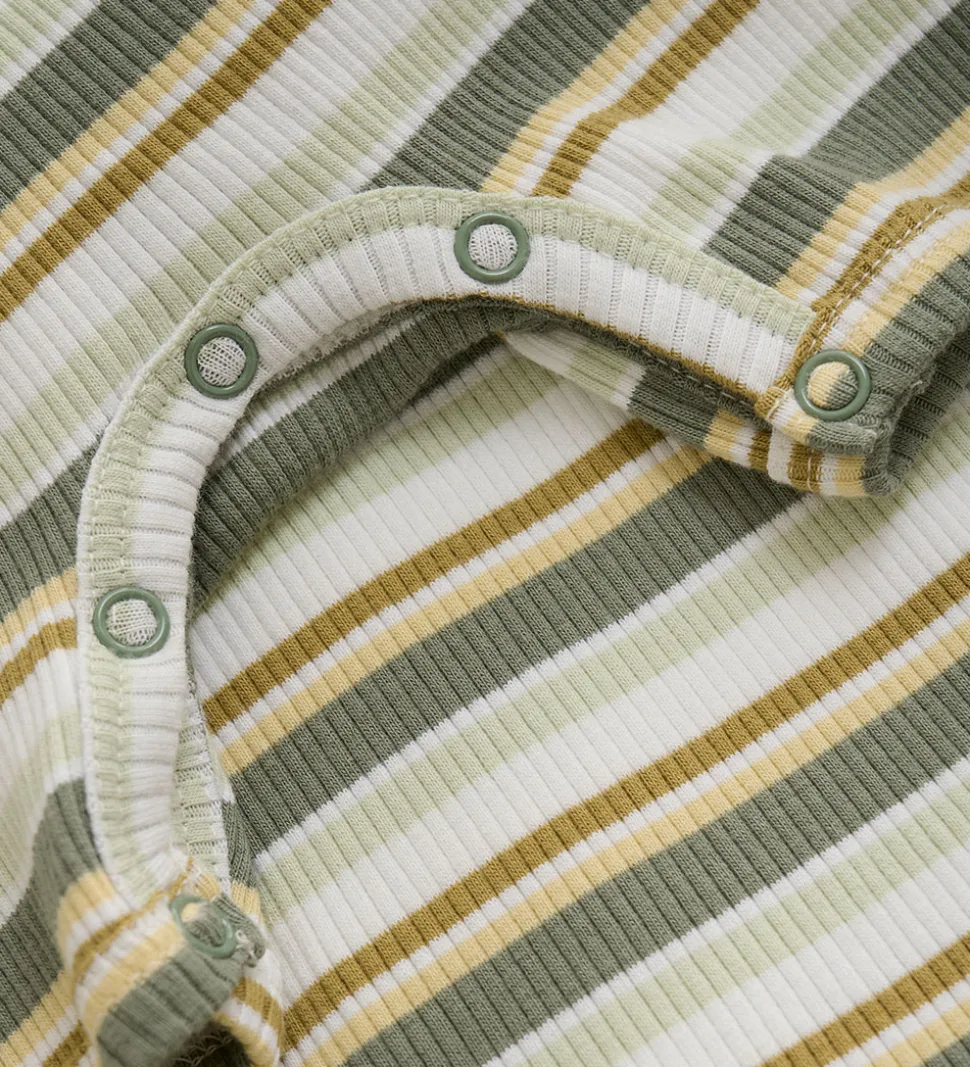 Lækker Minymo sommerdragt med et stribet design i grønne, gule, hvide og brune nuancer og en lækker ribstruktur.